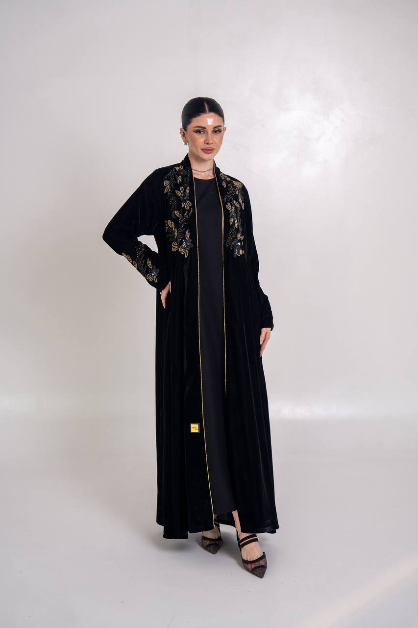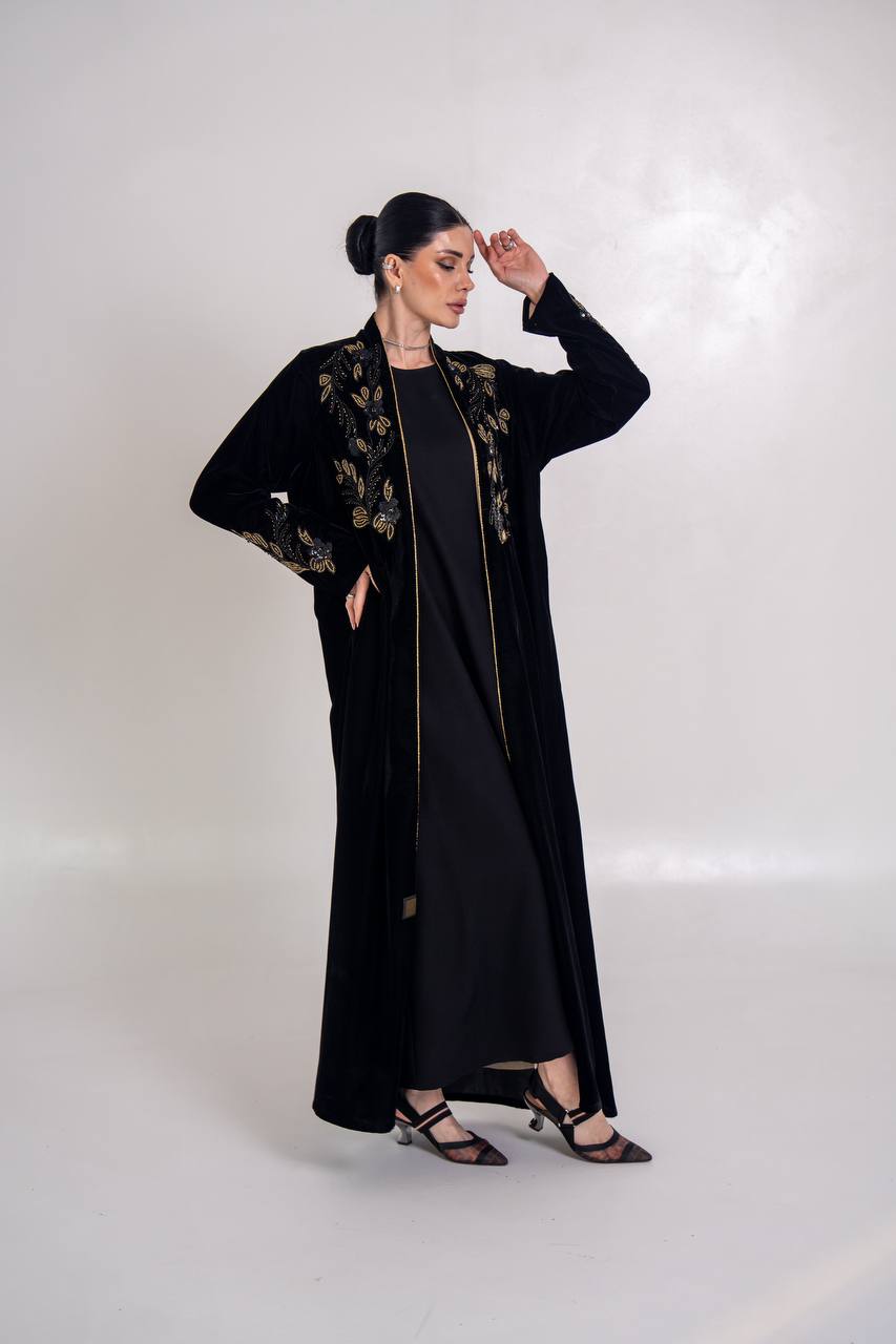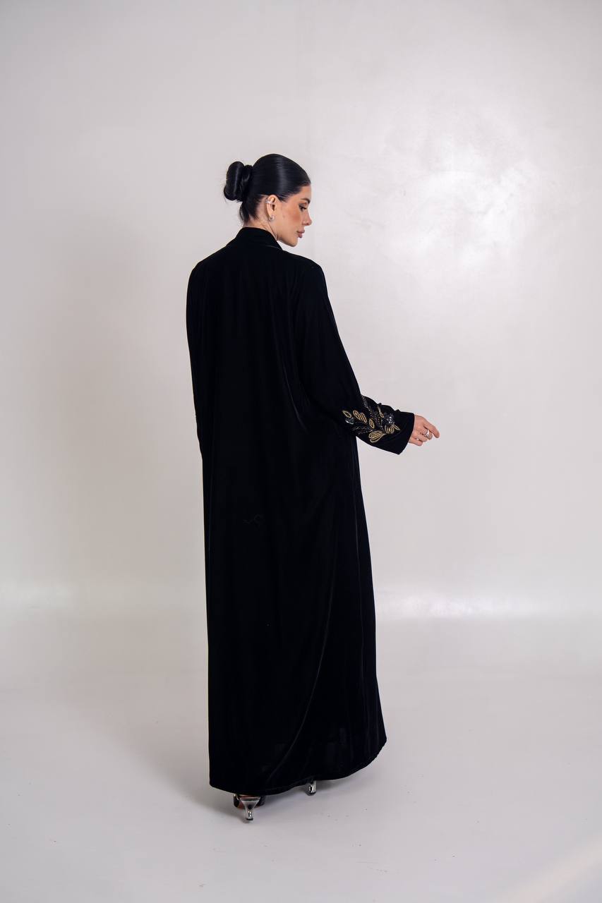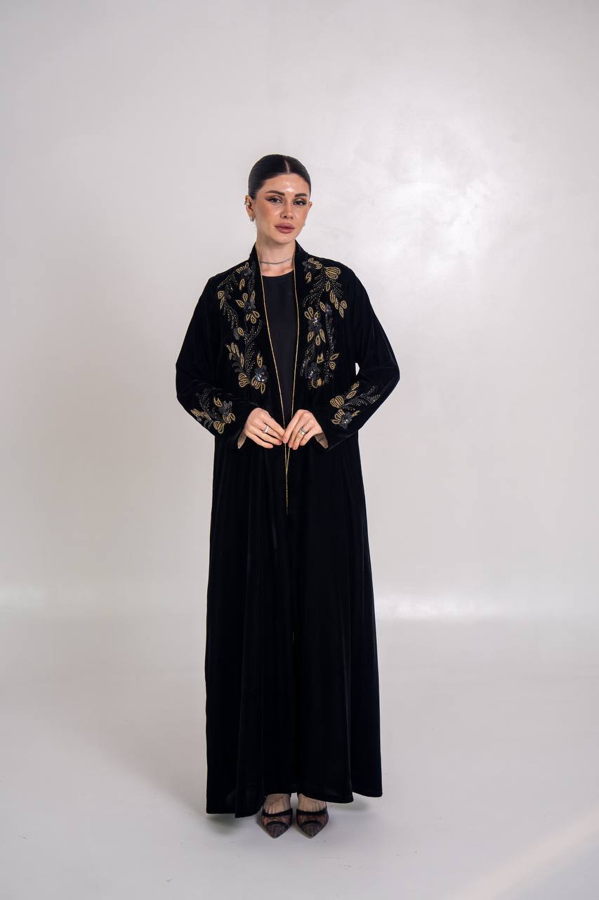 عباية مخمل باللون الاسود مع شك يدوي