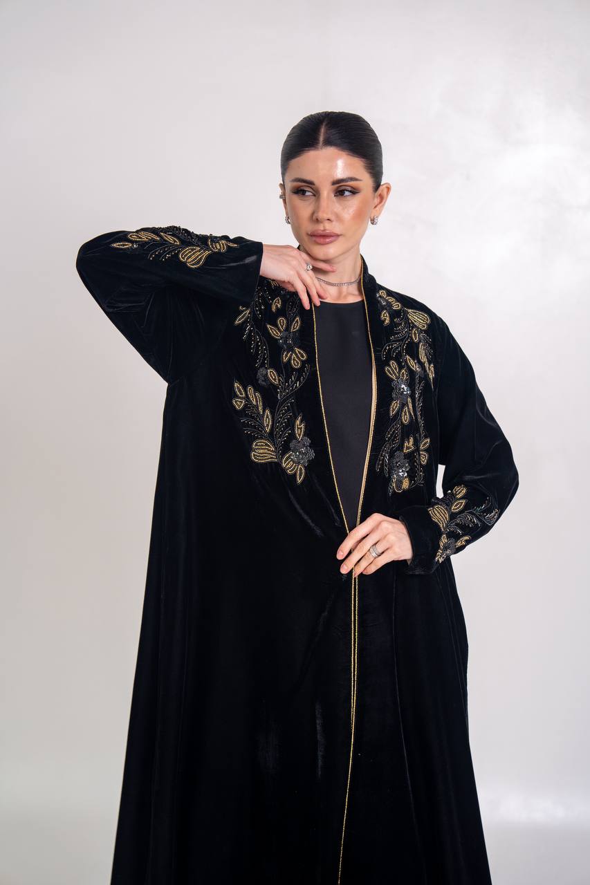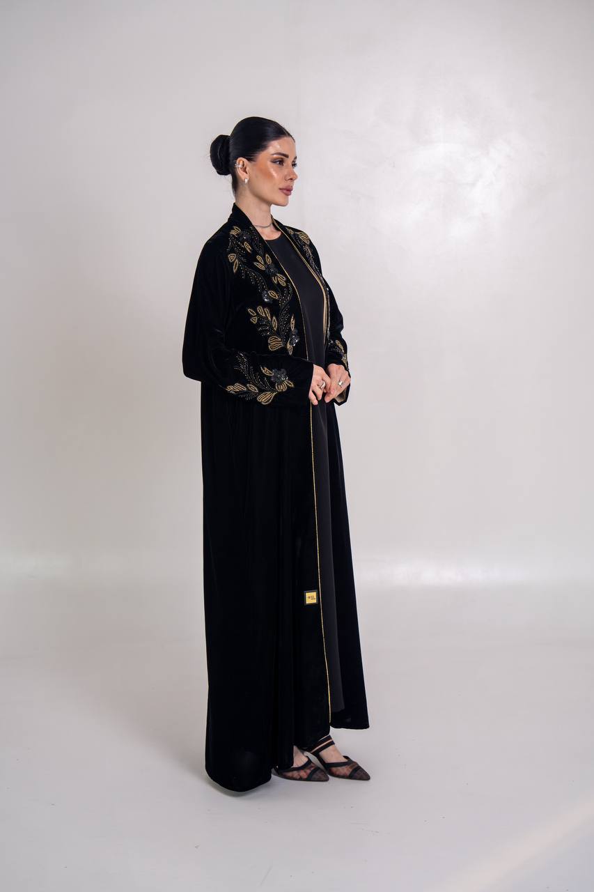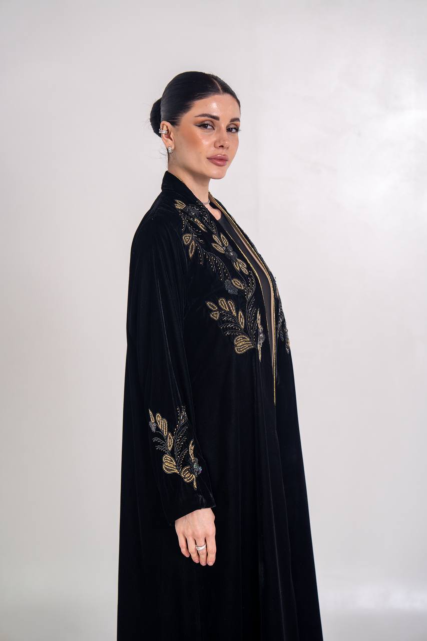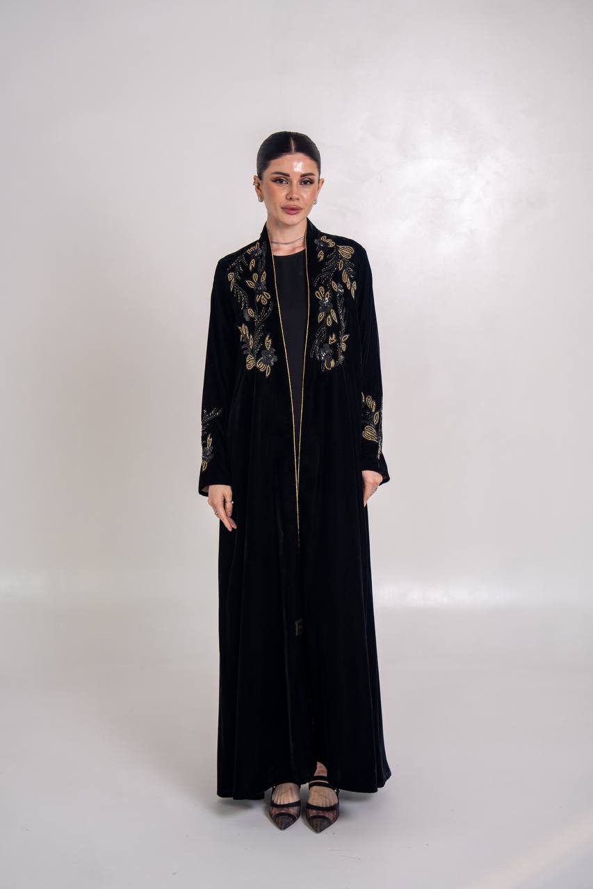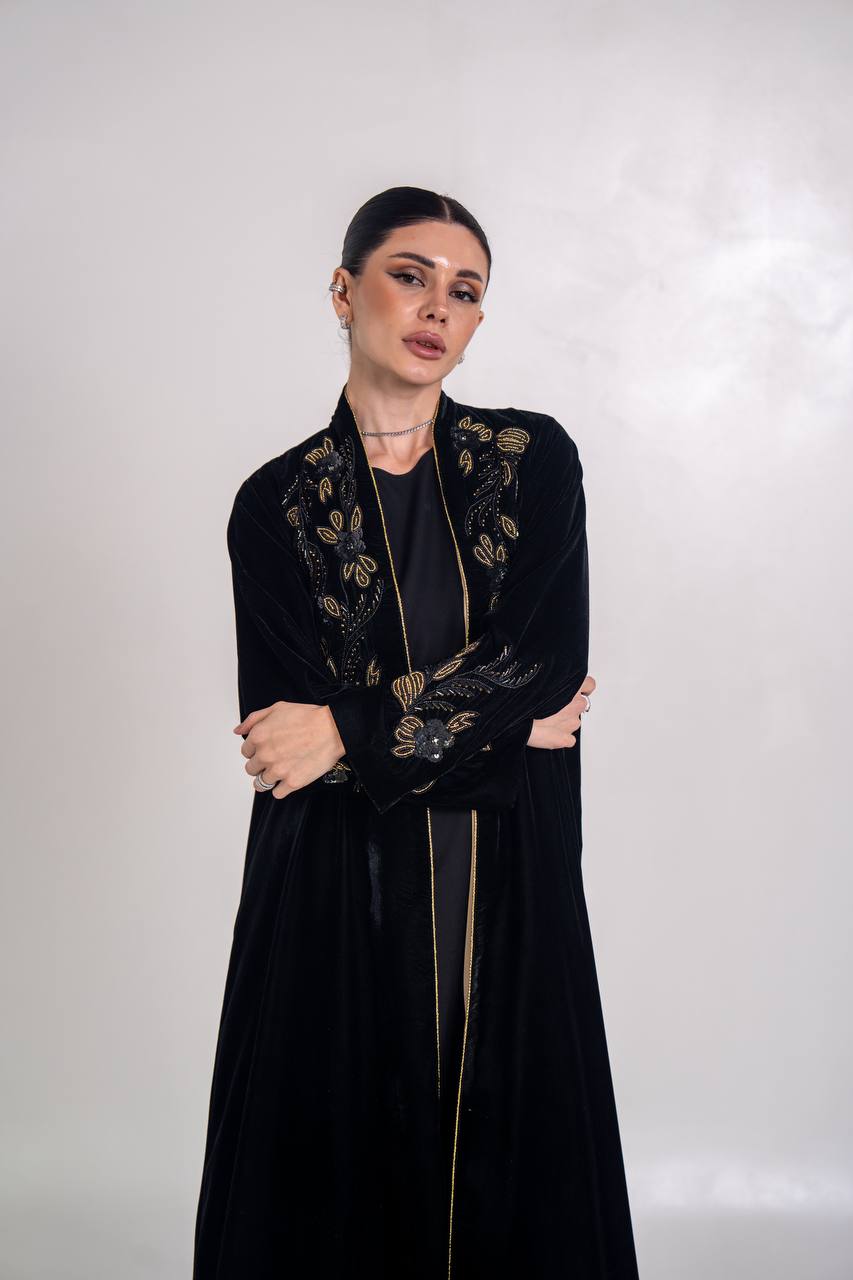 عباية مخمل باللون الاسود مع شك يدوي