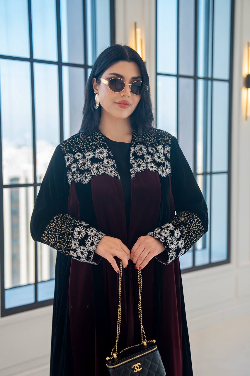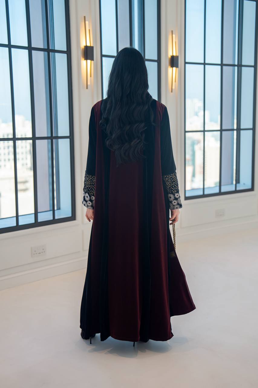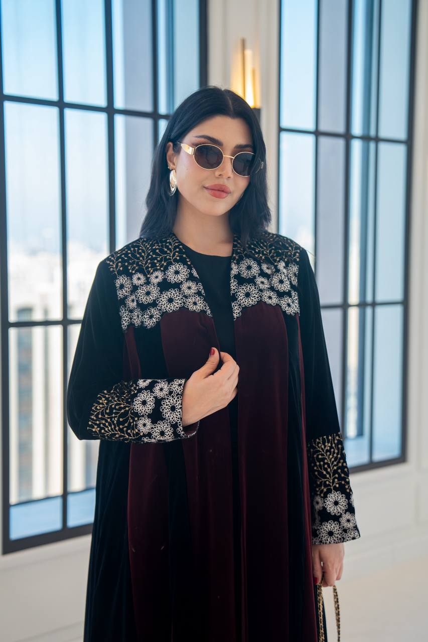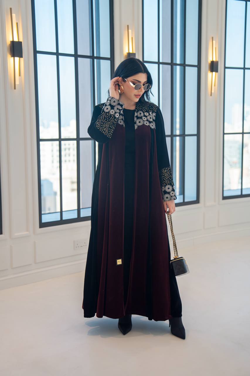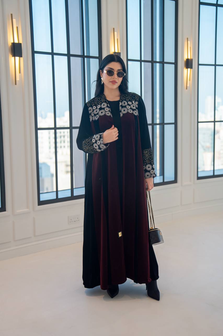 عباية أنيقة من المخمل باللون العنابي، مزينة بتطريز فخم يضيف لمسة من الرقي والجمال على إطلالتكِ. متوفر بجميع المقاسات . ( السعر للعباية فقط و لا يشمل الطقم الداخلي )