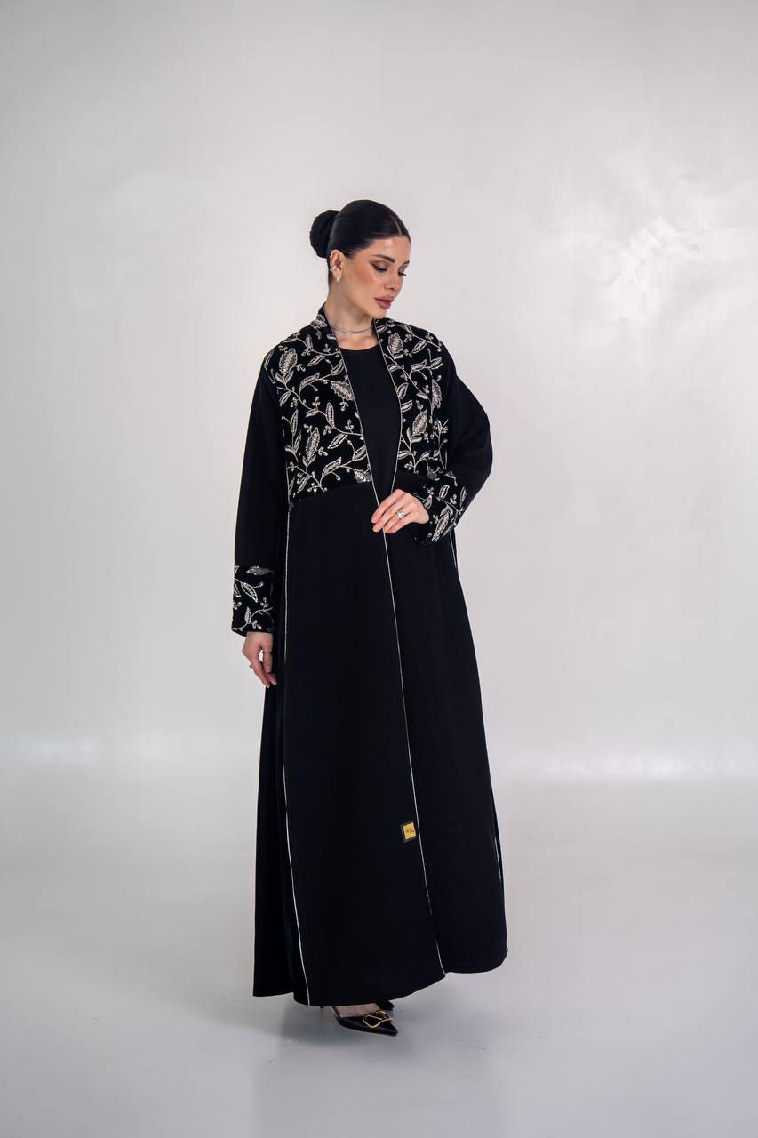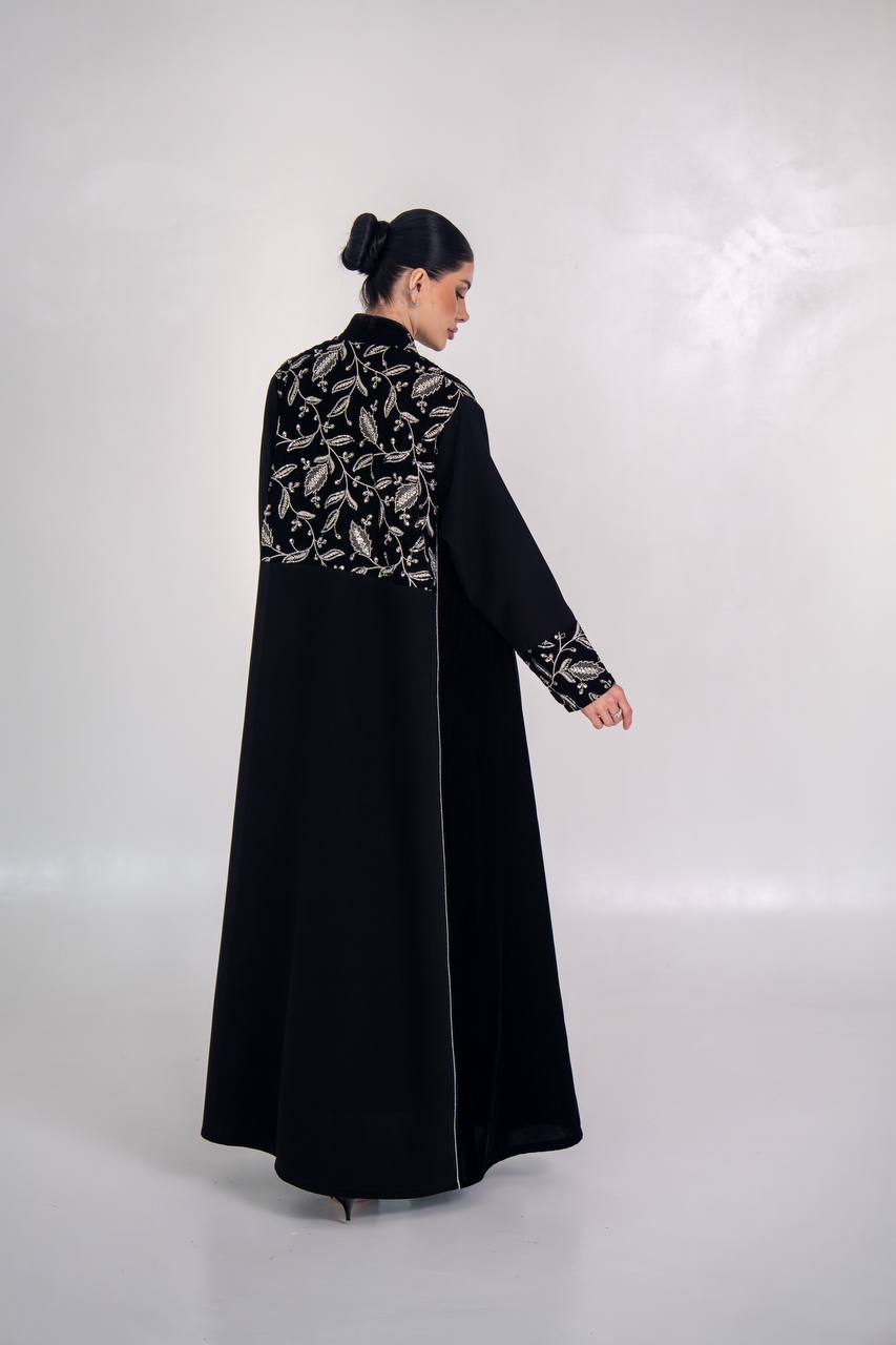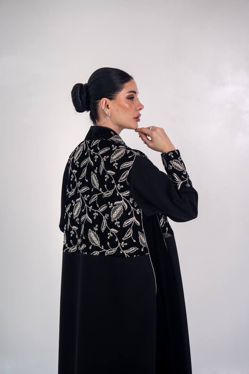 عباية راقية مصممة من خام الكريب الممتاز مع لمسات من المخمل المطرز و شك يدوي انيق يمنح العباية اناقة مميزة و طابع فخم ، مناسب للطلعات ، الدوام و الجامعات . متوفر بجميع المقاسات و الطول حسب طلبكم .