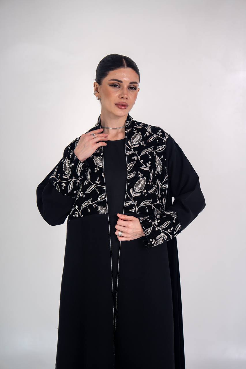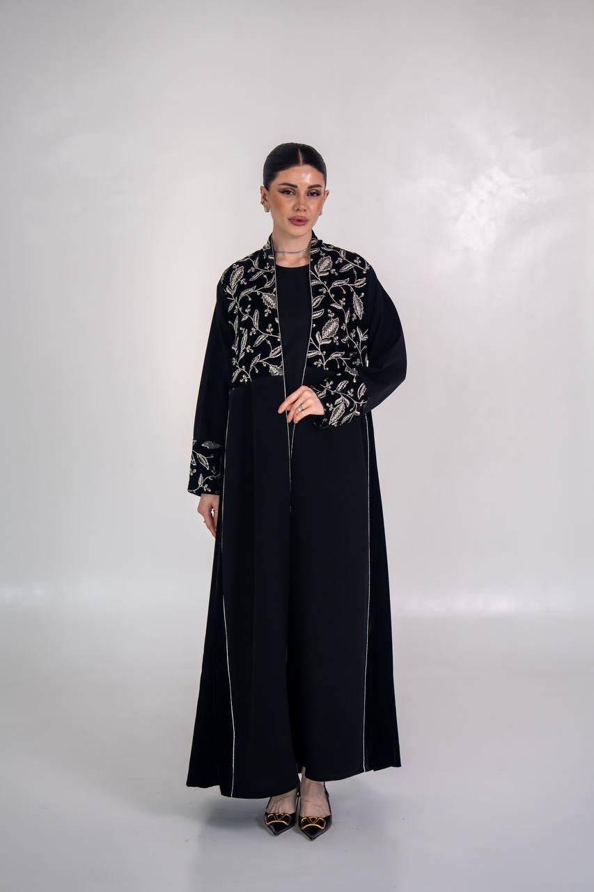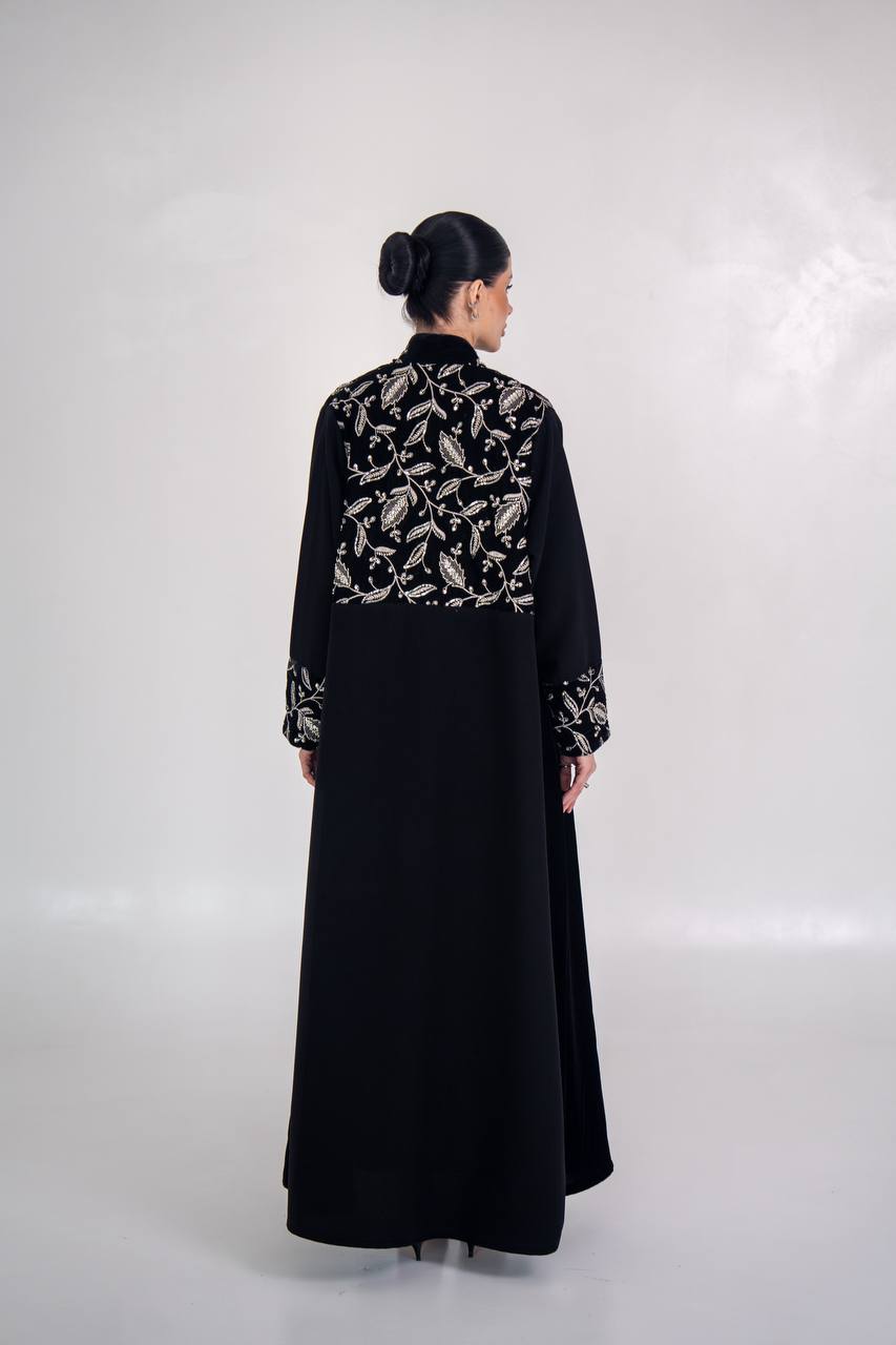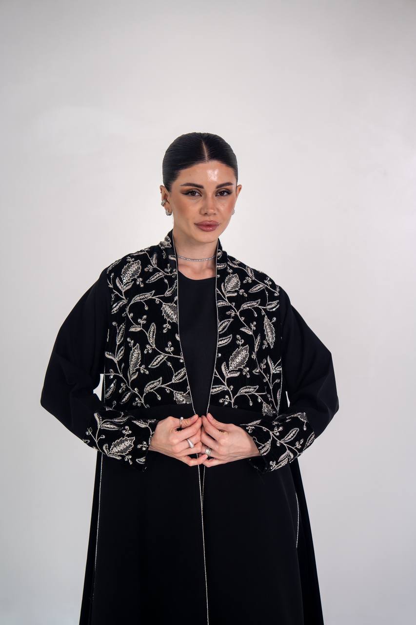 عباية راقية مصممة من خام الكريب الممتاز مع لمسات من المخمل المطرز و شك يدوي انيق يمنح العباية اناقة مميزة و طابع فخم ، مناسب للطلعات ، الدوام و الجامعات . متوفر بجميع المقاسات و الطول حسب طلبكم .