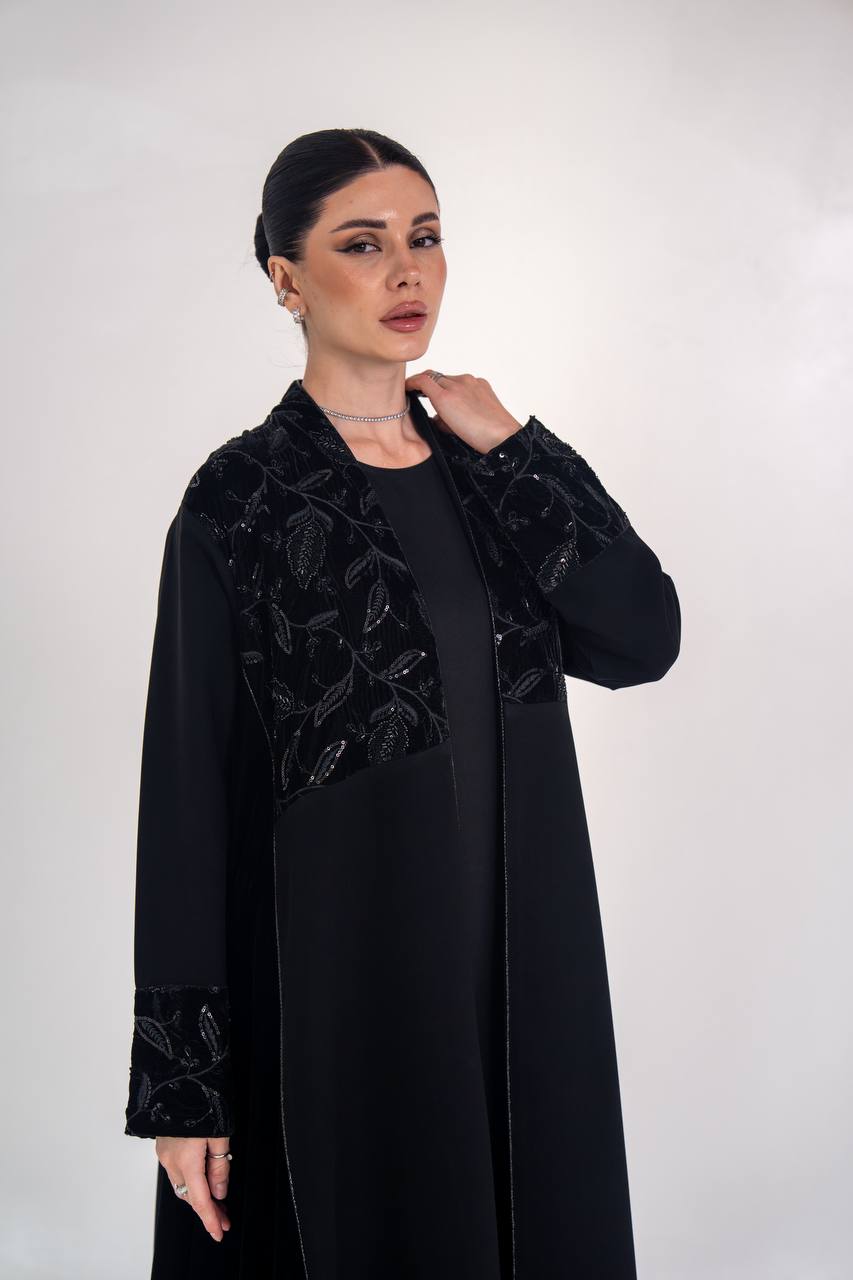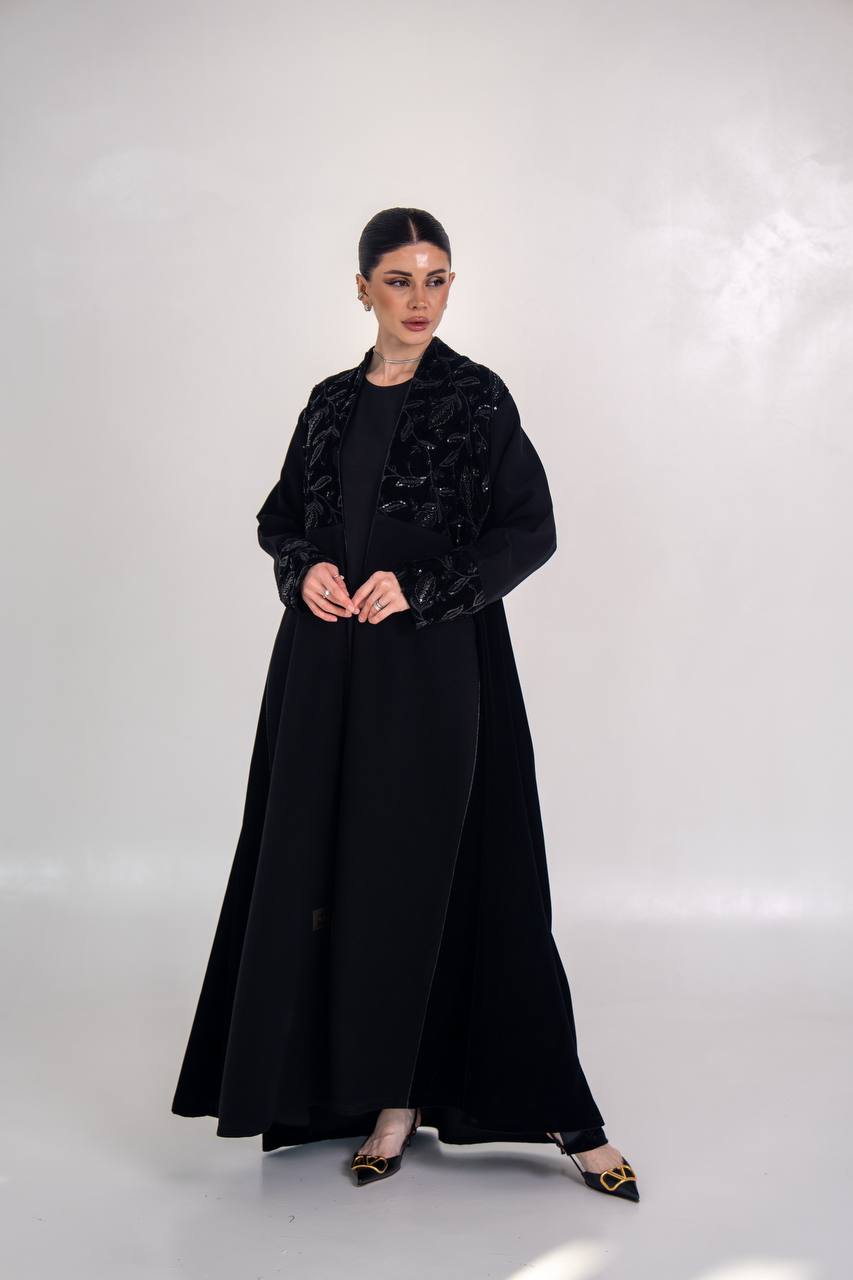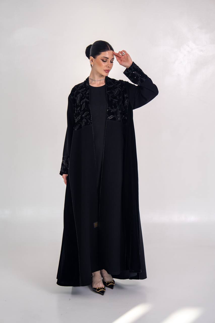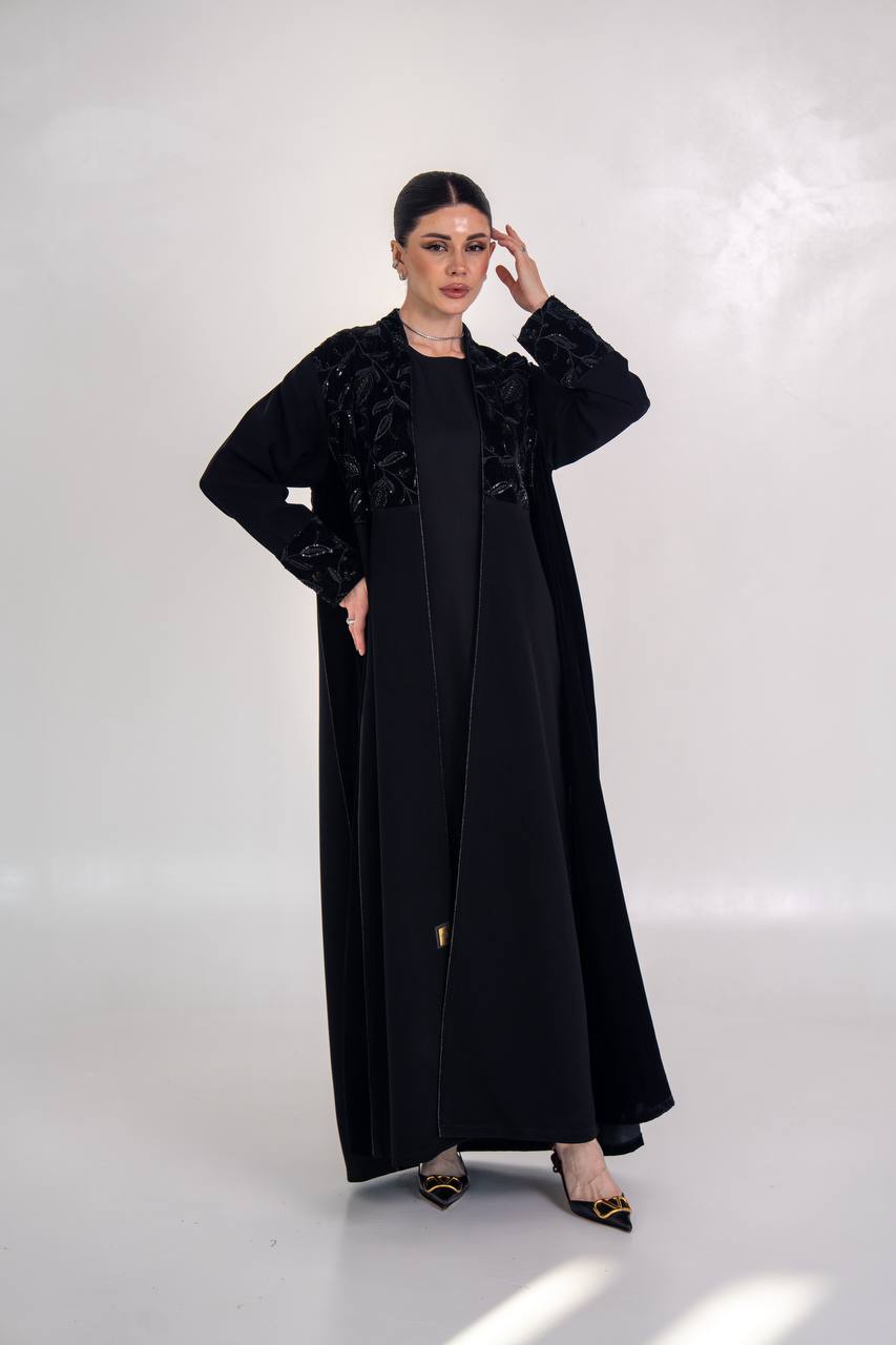 عباية انيقة مصممة من خام الكريب الممتاز مع لمسات من المخمل المطرز و الاجناب مع شك يدوي فاخر يمنح العباية اناقة مميزة و طابع انيق، مناسب للطلعات ، الدوام و الجامعات . متوفر بجميع المقاسات .( السعر للعباية فقط و لا يشمل الطقم الداخلي )