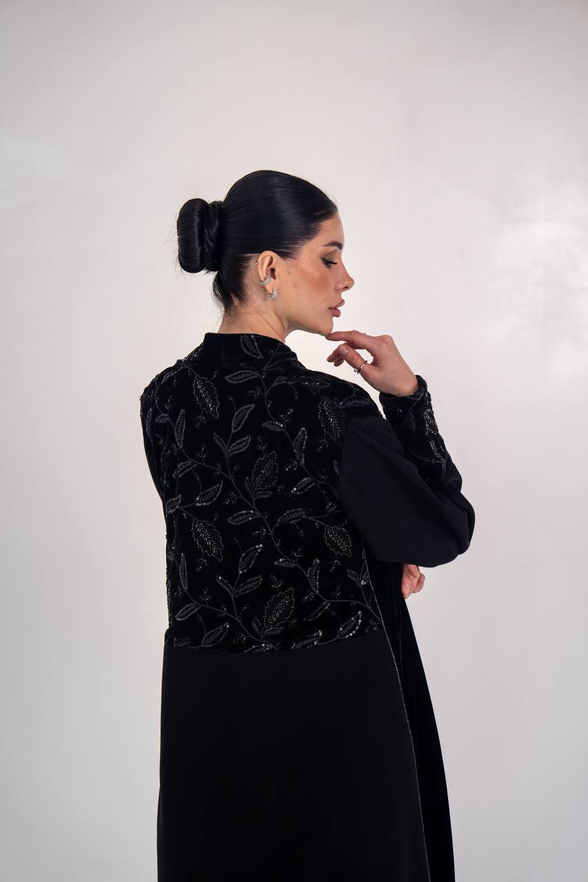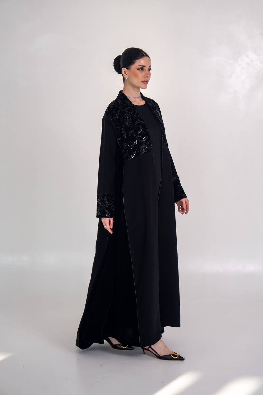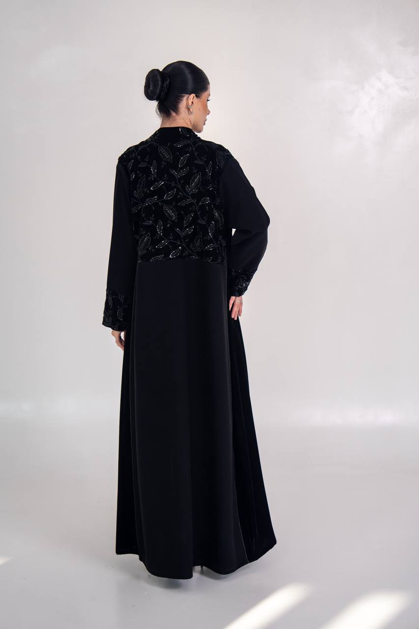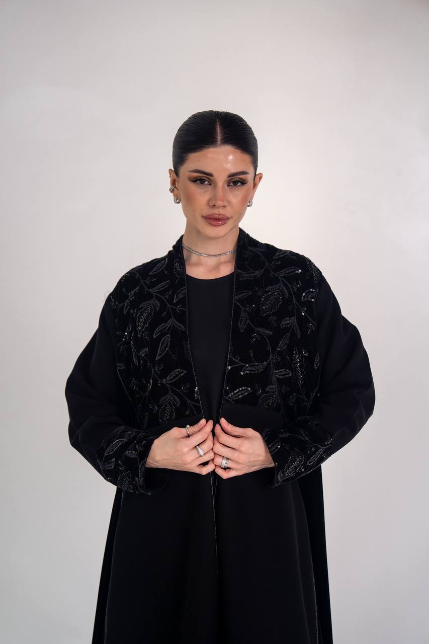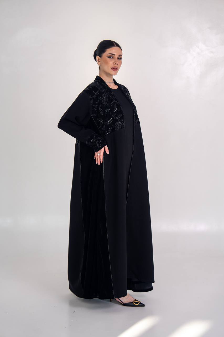 عباية انيقة مصممة من خام الكريب الممتاز مع لمسات من المخمل المطرز و الاجناب مع شك يدوي فاخر يمنح العباية اناقة مميزة و طابع انيق، مناسب للطلعات ، الدوام و الجامعات . متوفر بجميع المقاسات .( السعر للعباية فقط و لا يشمل الطقم الداخلي )
