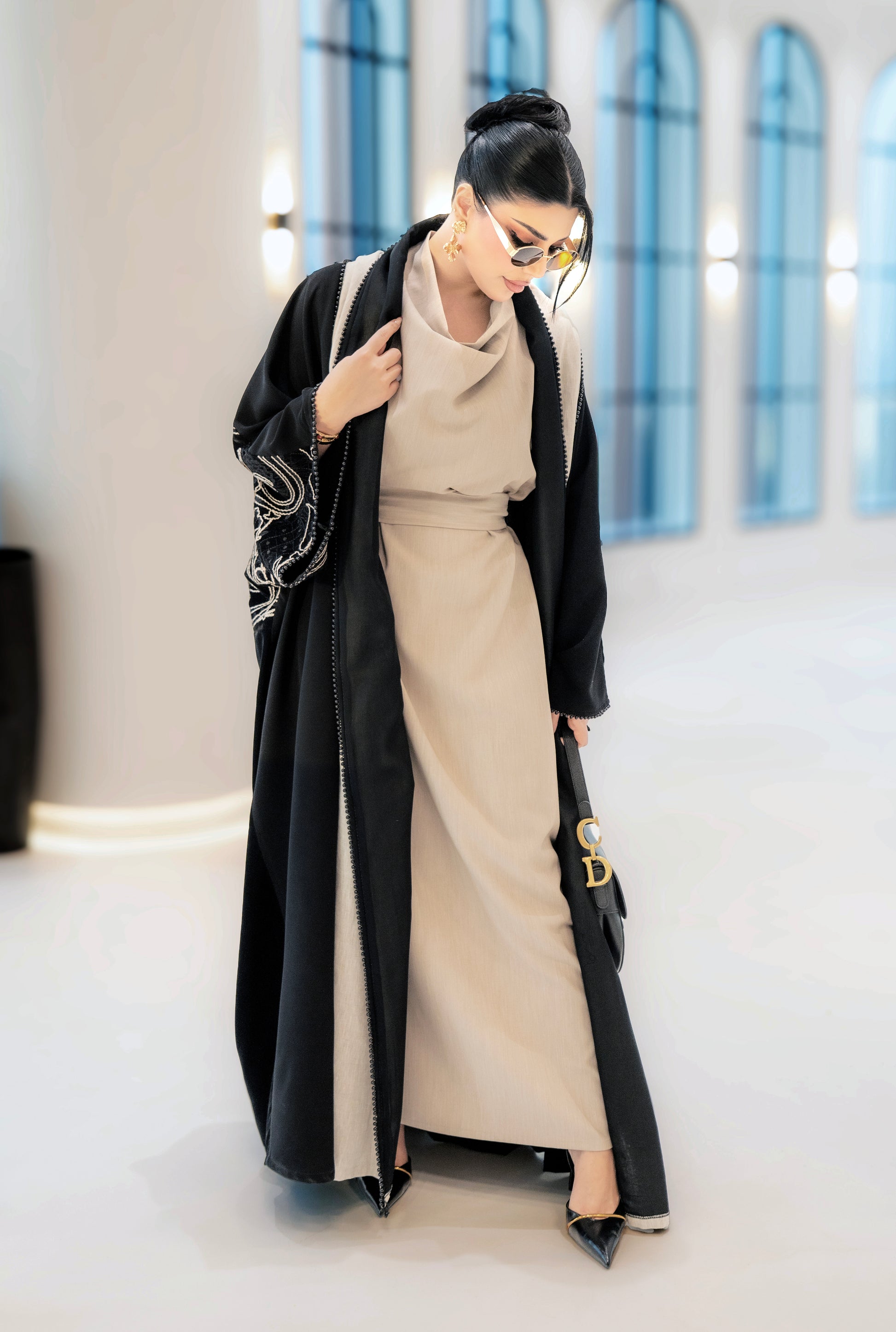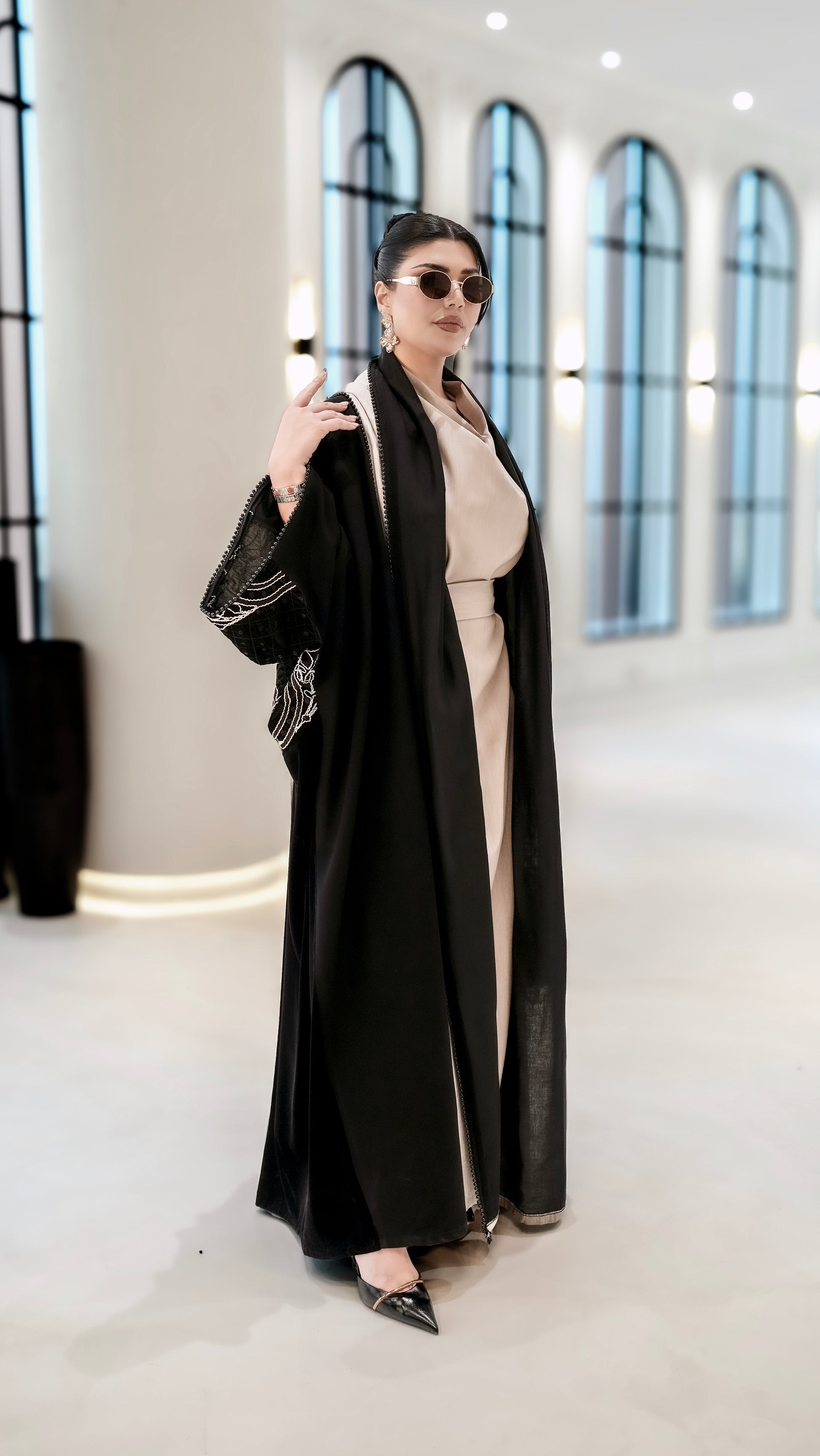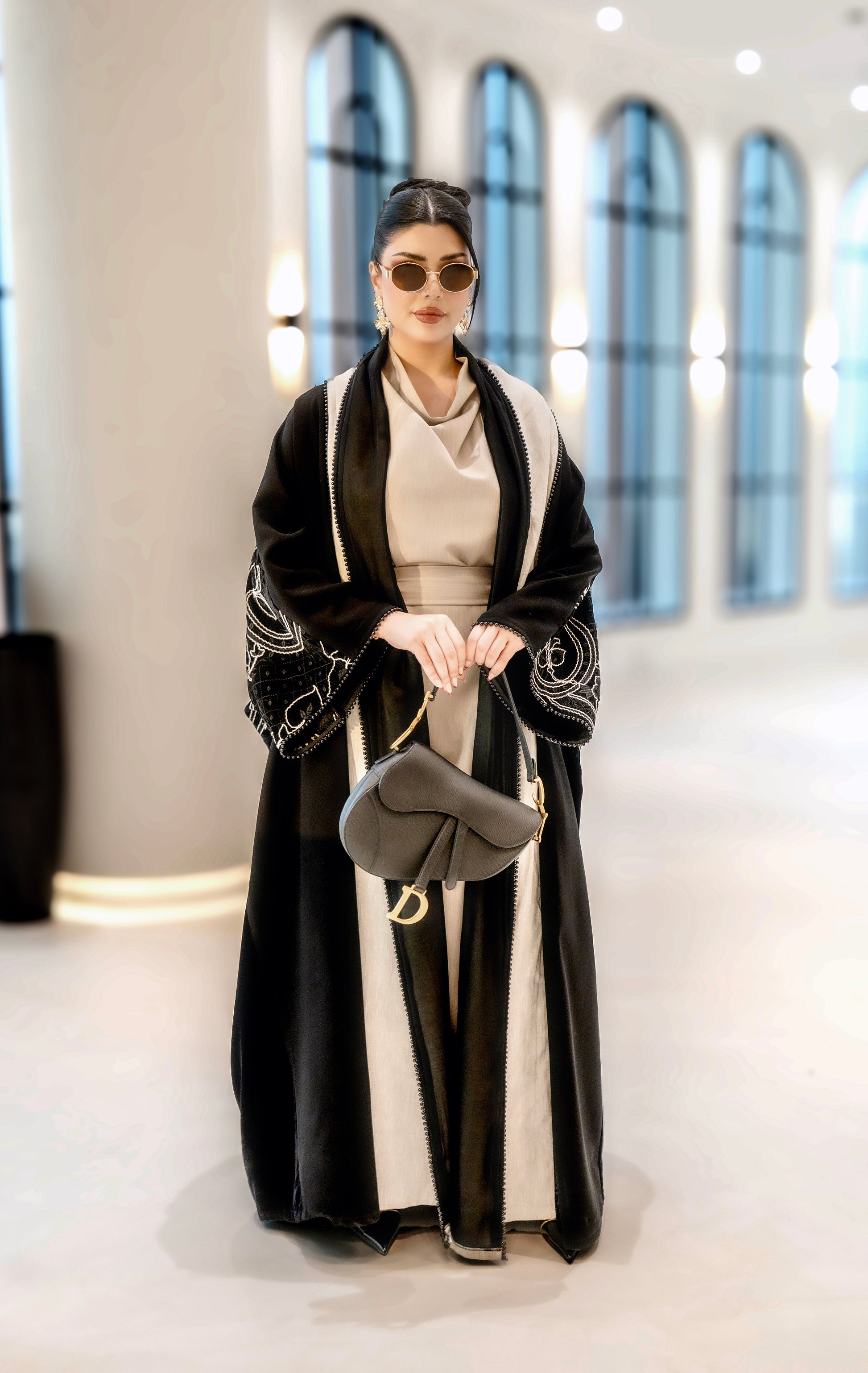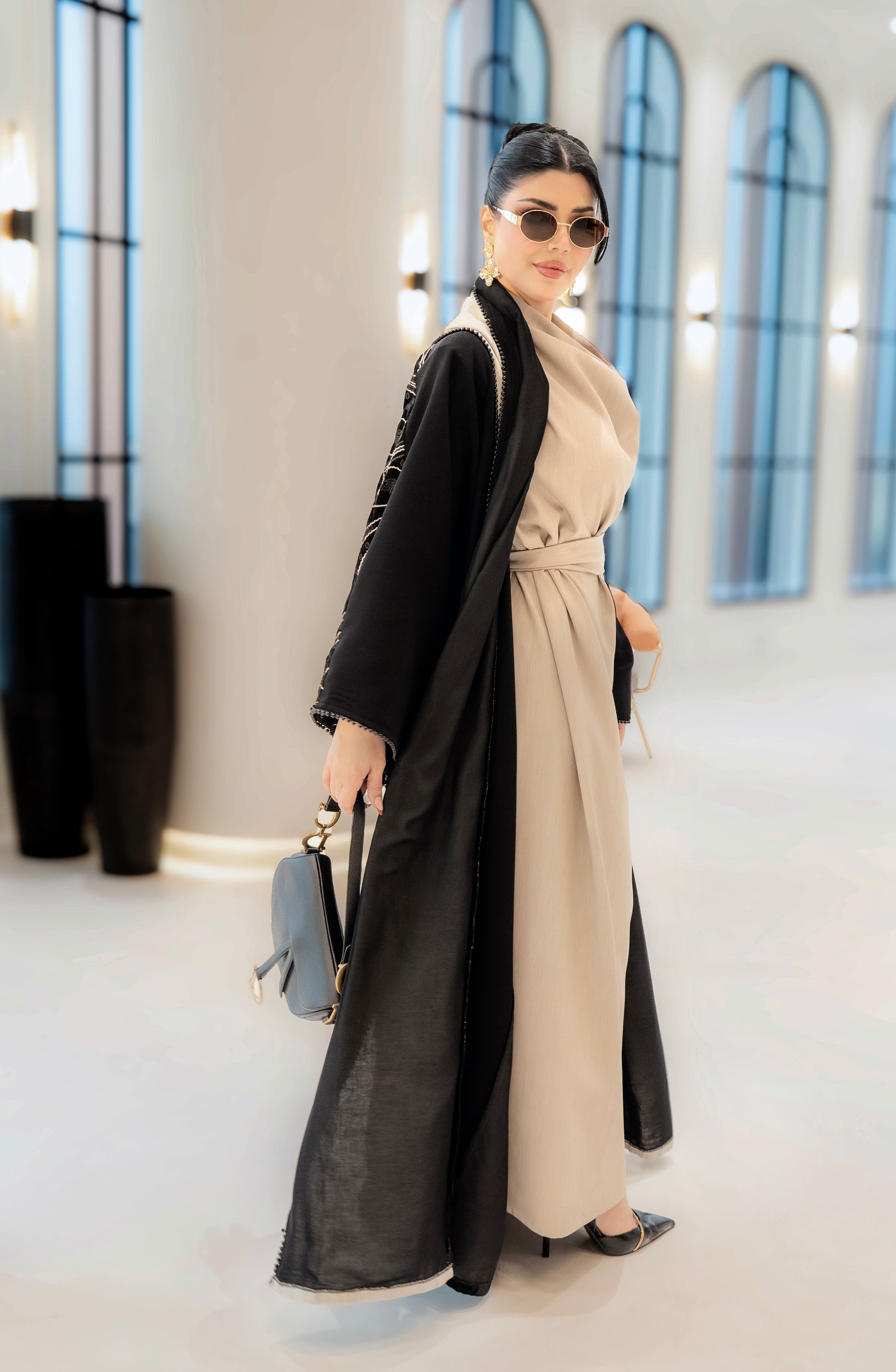 A black abaya with soft beige detailing along the front and sleeves, featuring elegant embroidered accents. Designed with a flowing silhouette that blends classic black with warm neutral tones for a refined, modern look.
