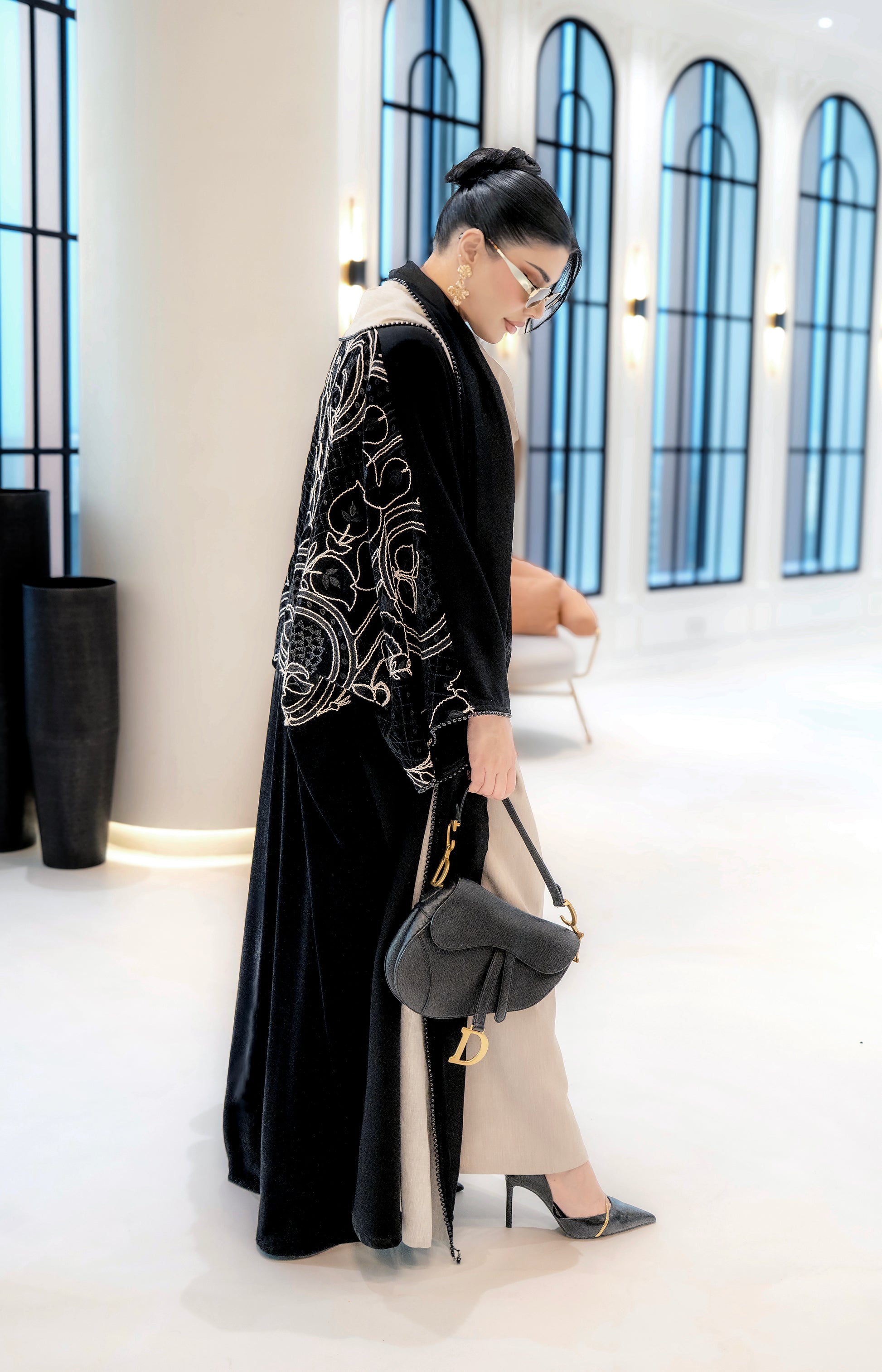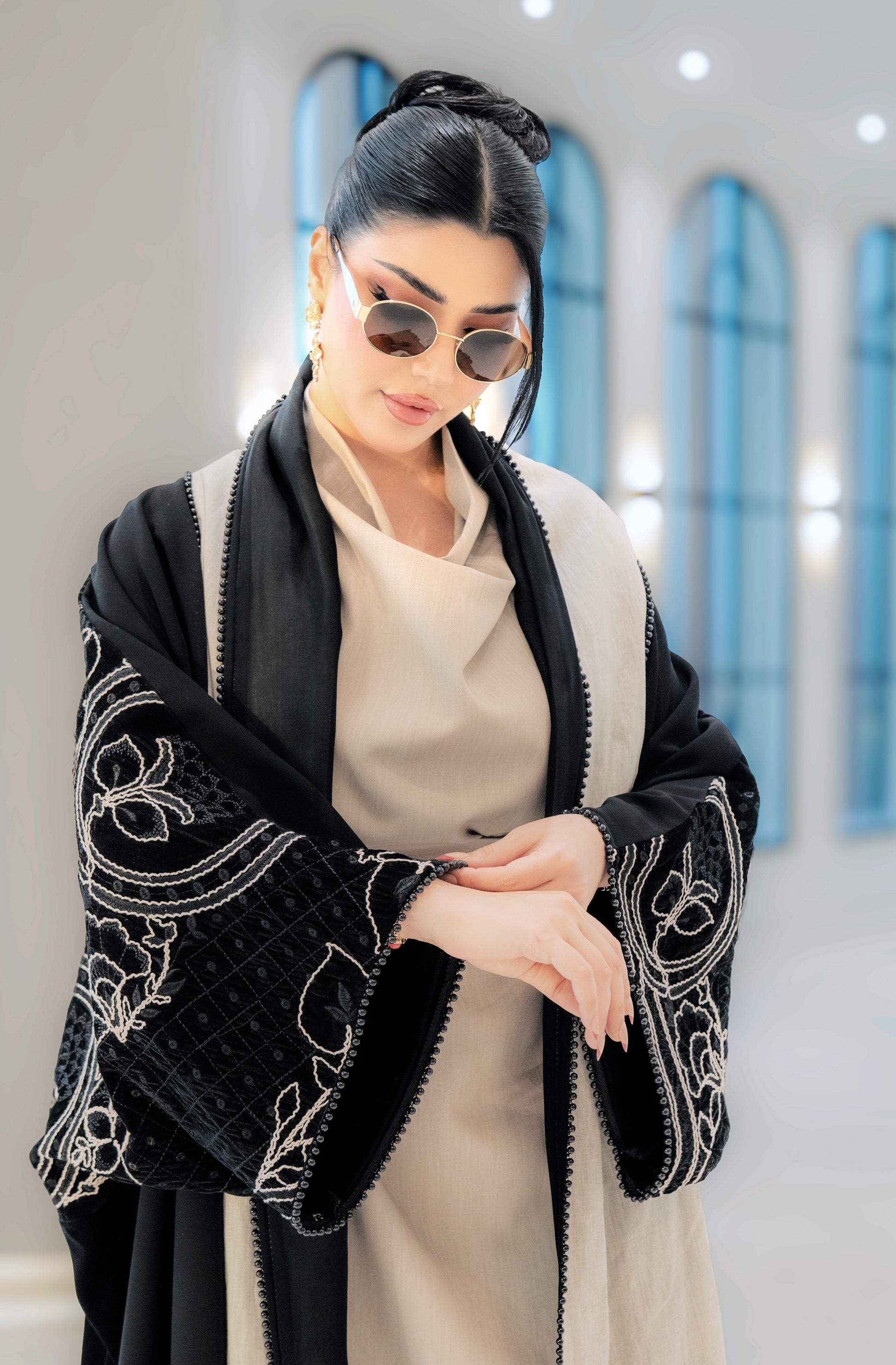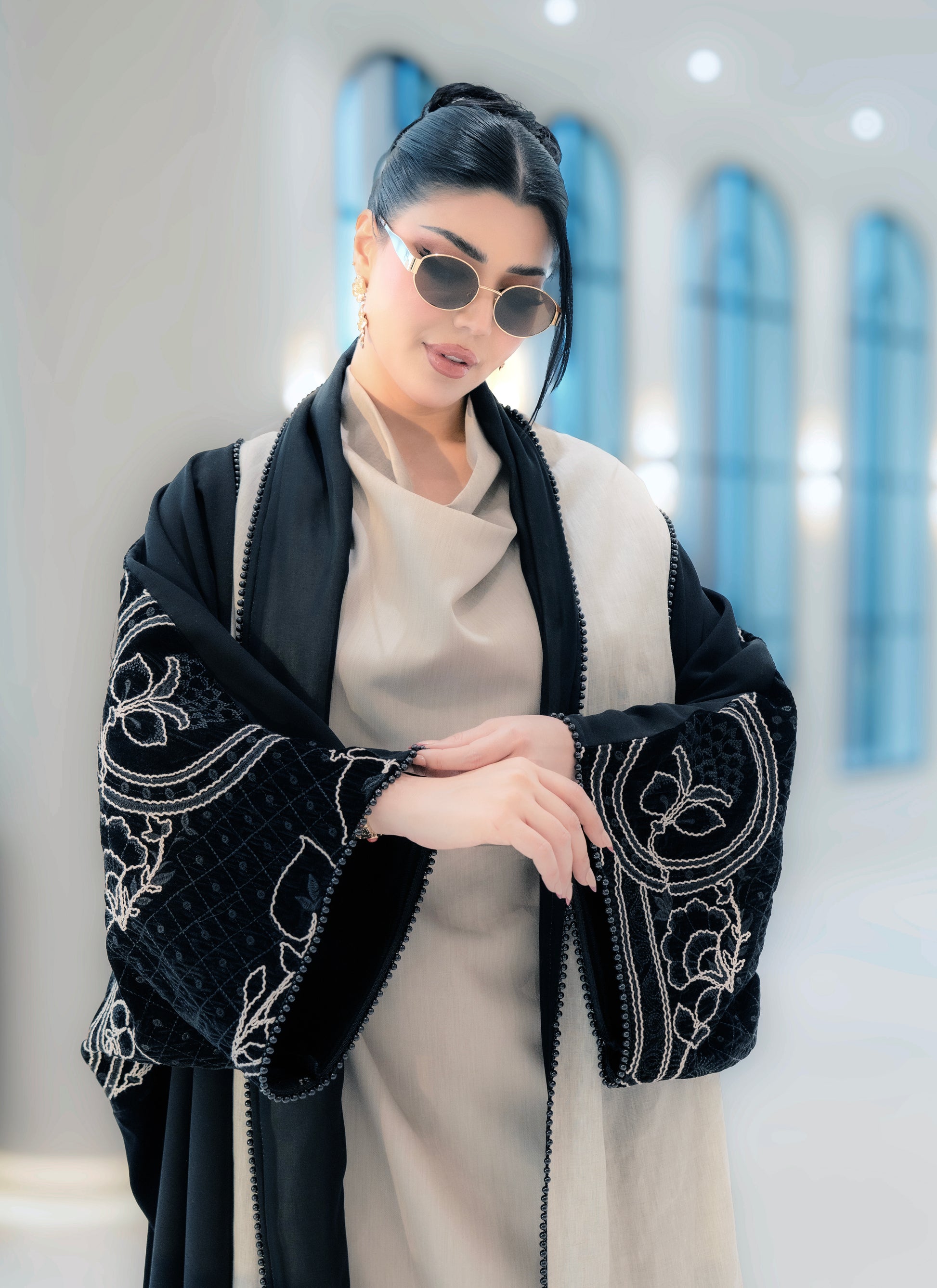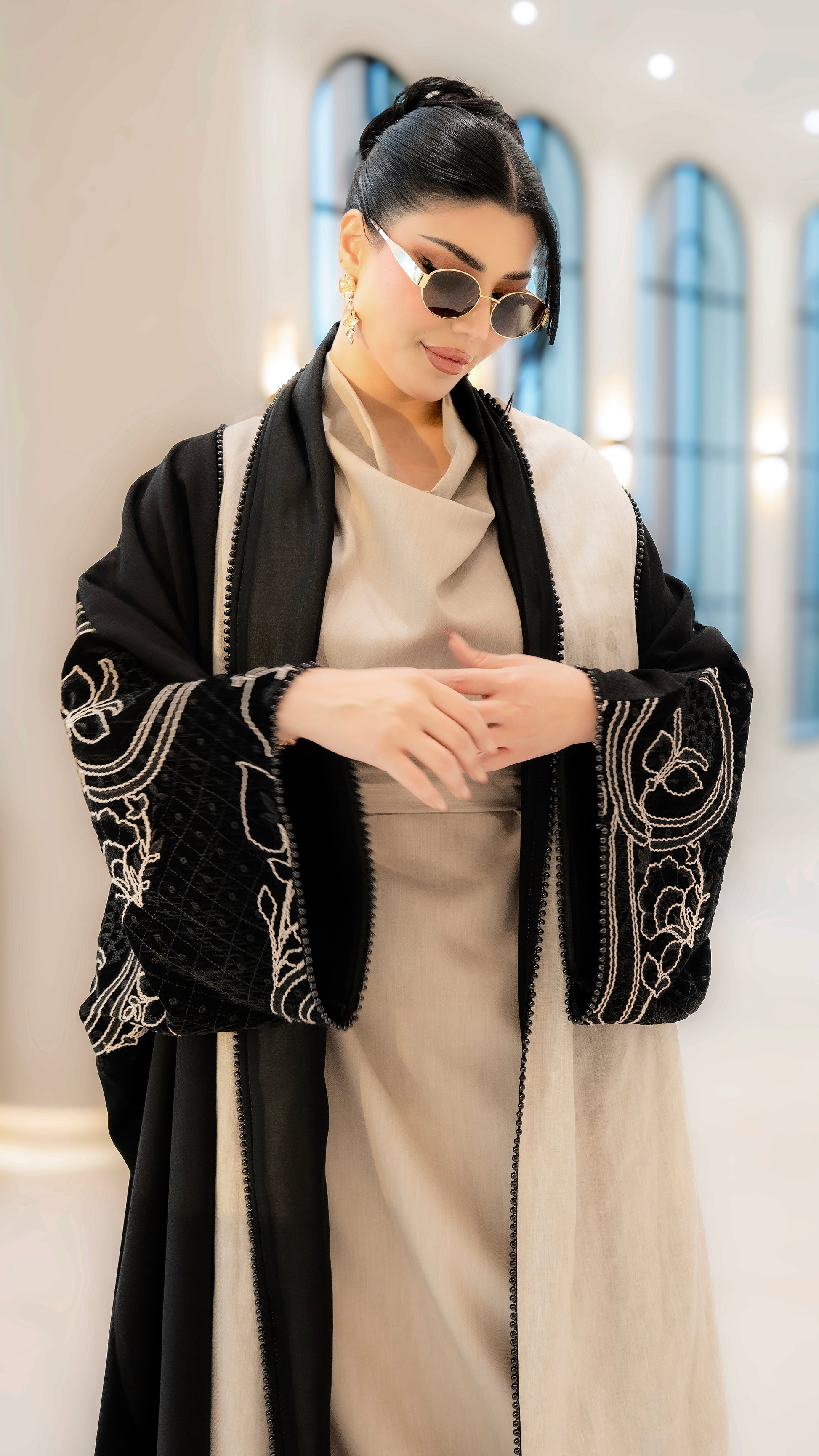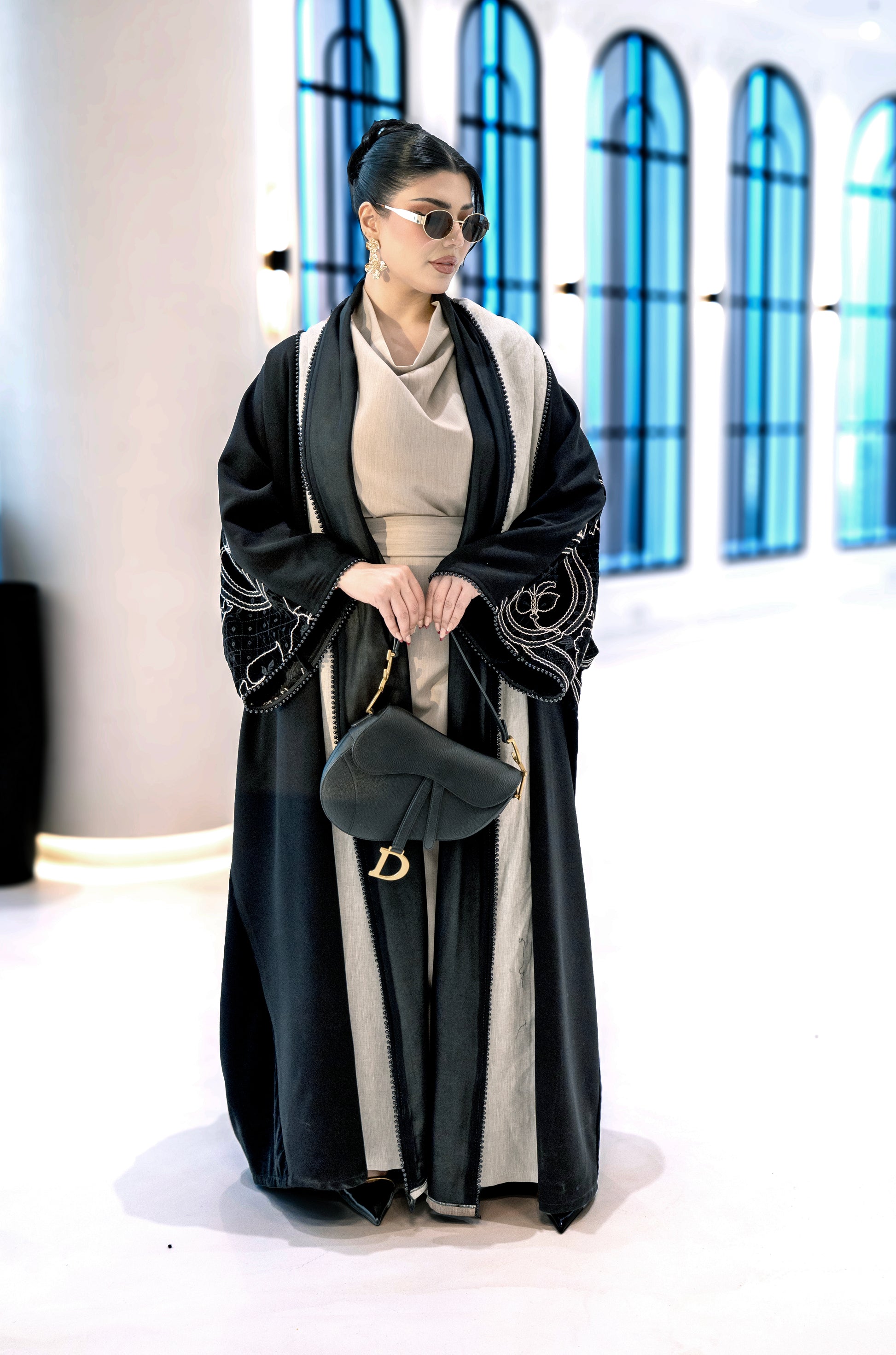 A black abaya with soft beige detailing along the front and sleeves, featuring elegant embroidered accents. Designed with a flowing silhouette that blends classic black with warm neutral tones for a refined, modern look.