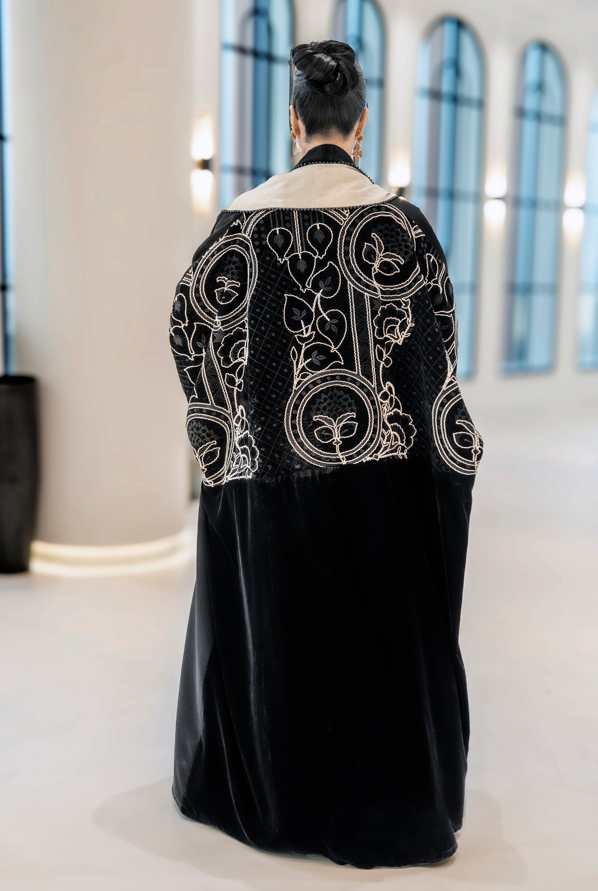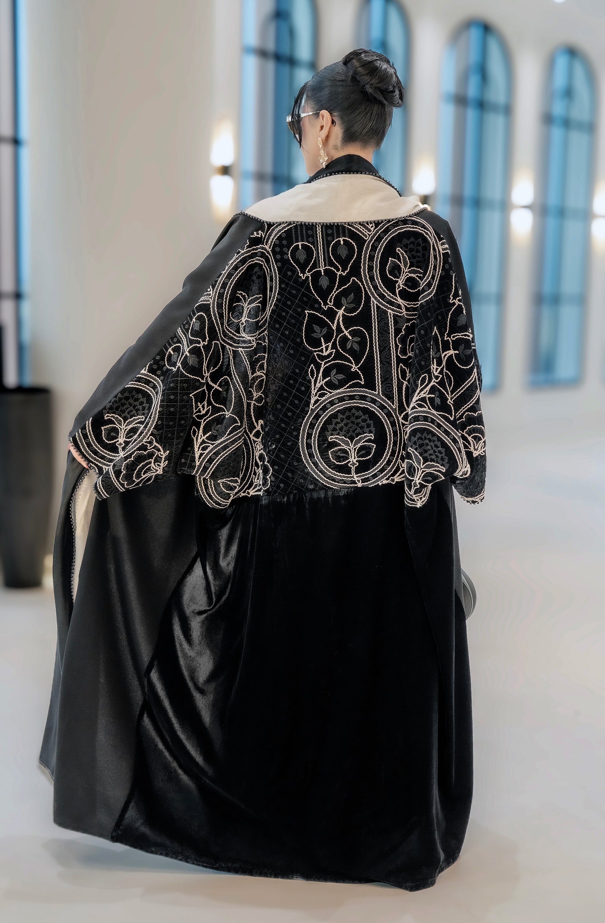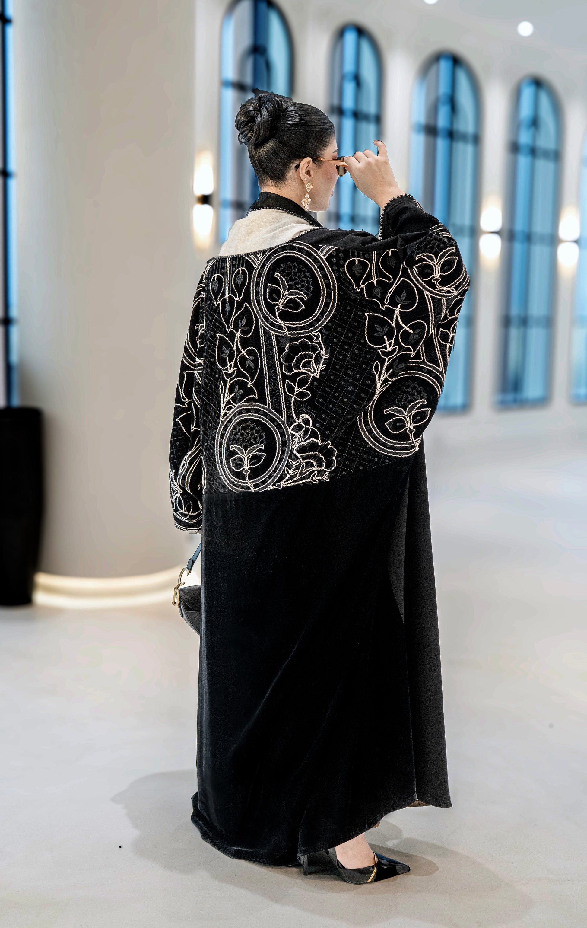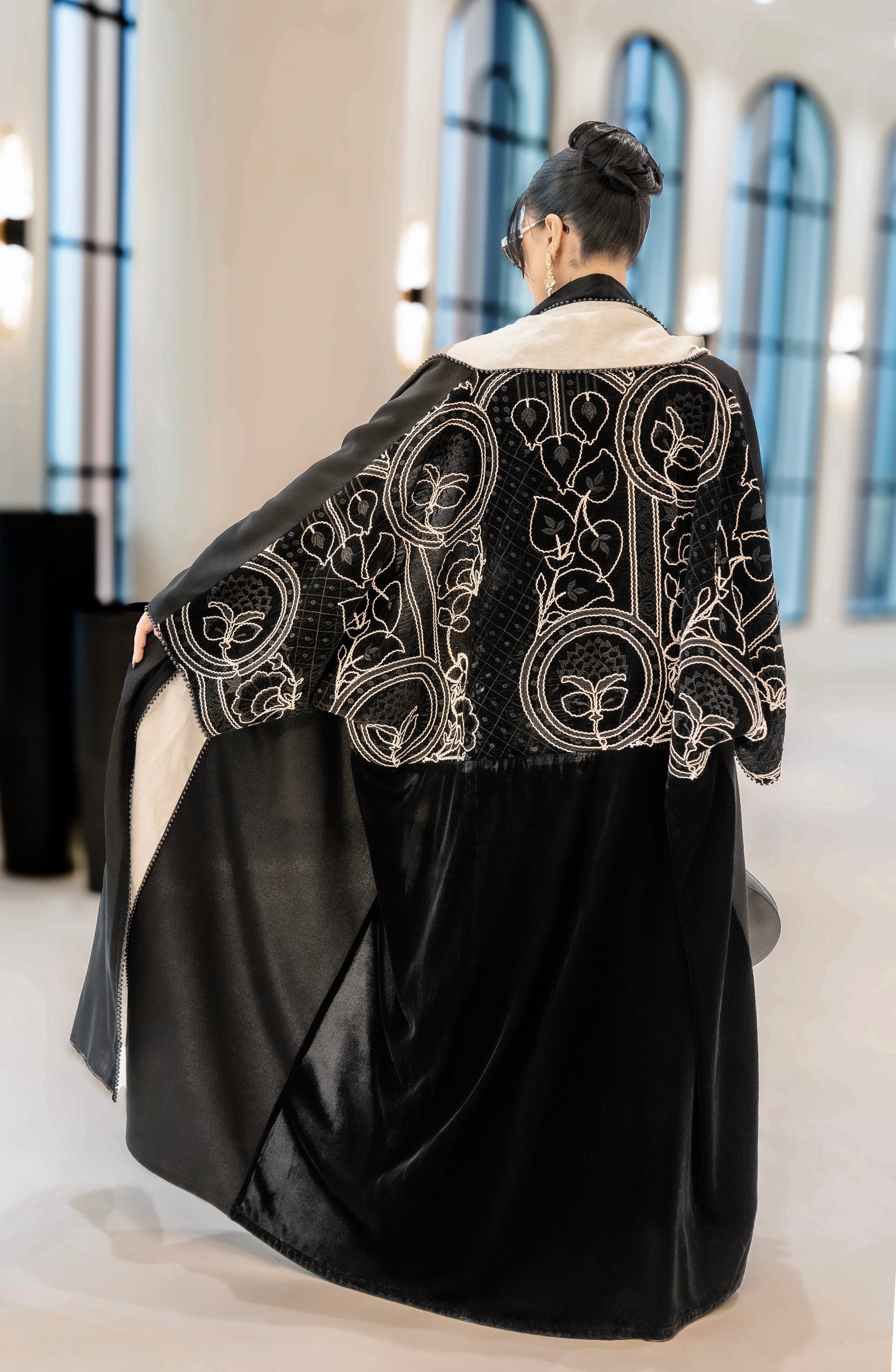 A black abaya with soft beige detailing along the front and sleeves, featuring elegant embroidered accents. Designed with a flowing silhouette that blends classic black with warm neutral tones for a refined, modern look.