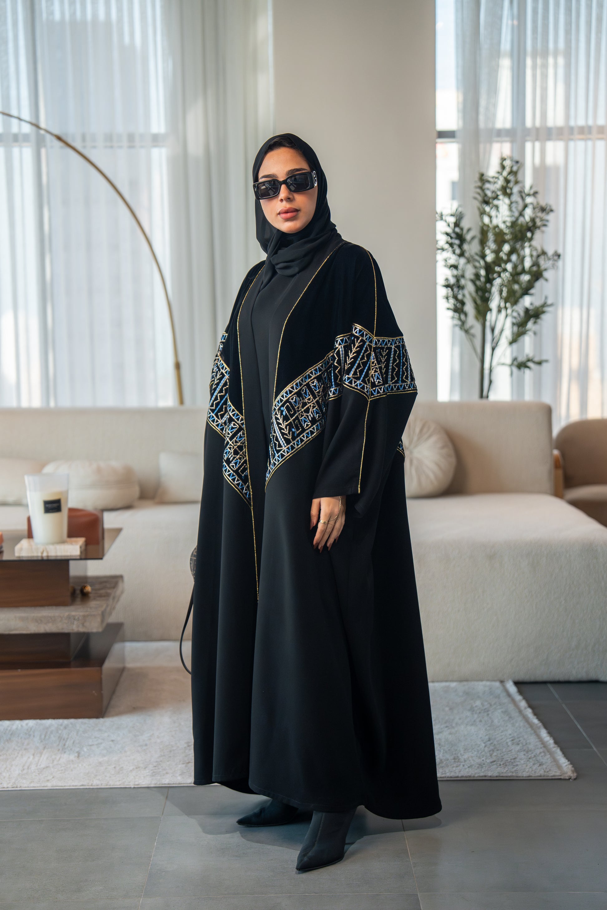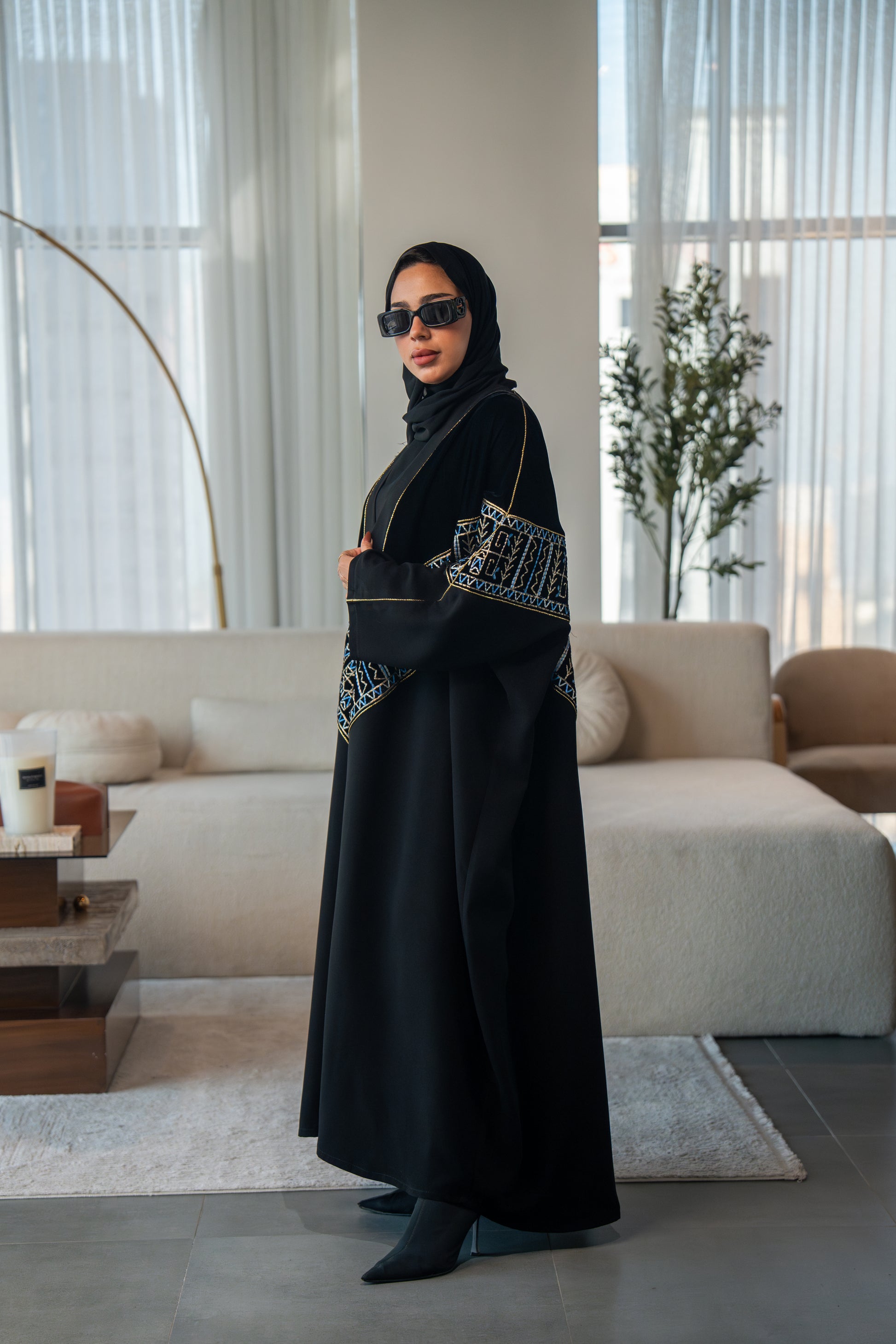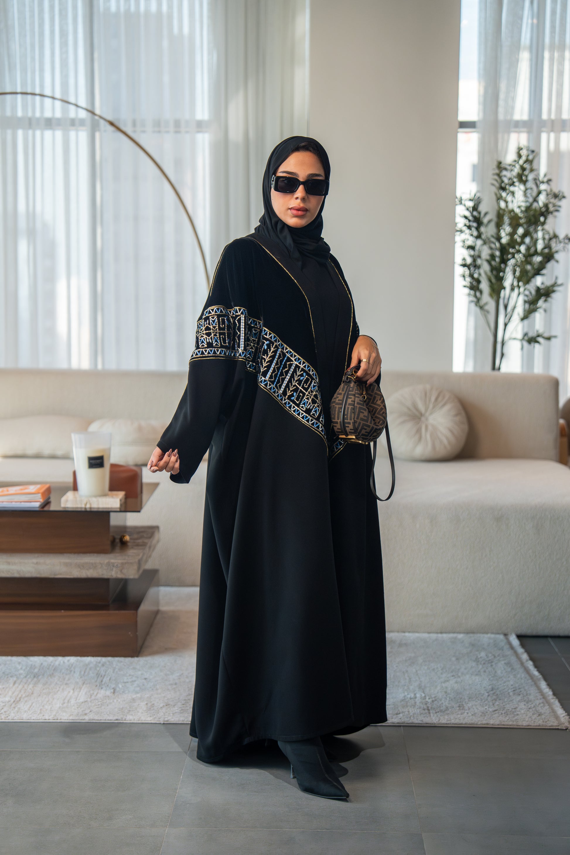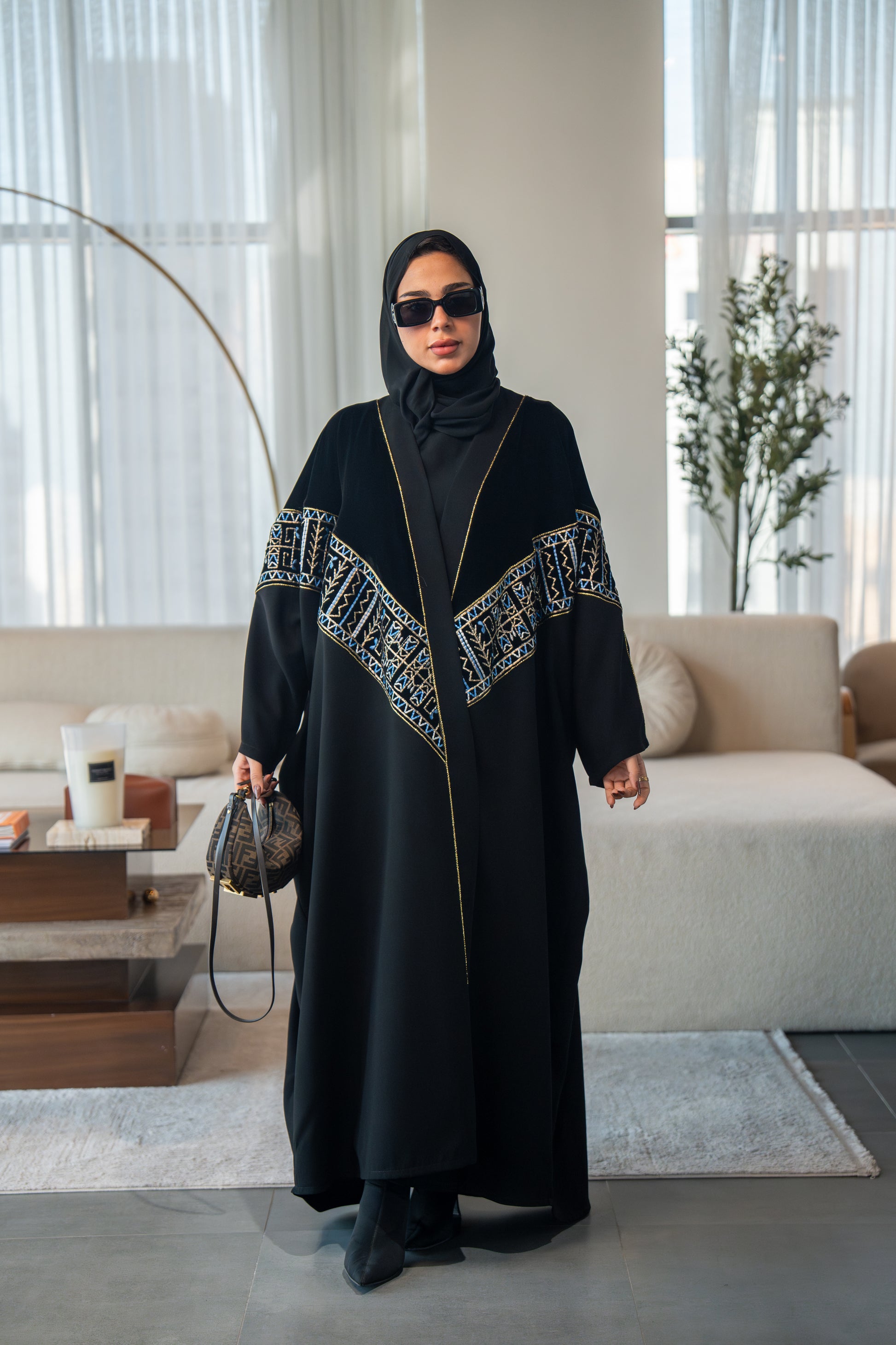 A black abaya designed with detailed geometric embroidery in rich gold and beige tones. Made from a soft, comfortable fabric with a structured, elegant look. Perfect for both everyday outings and special occasions.