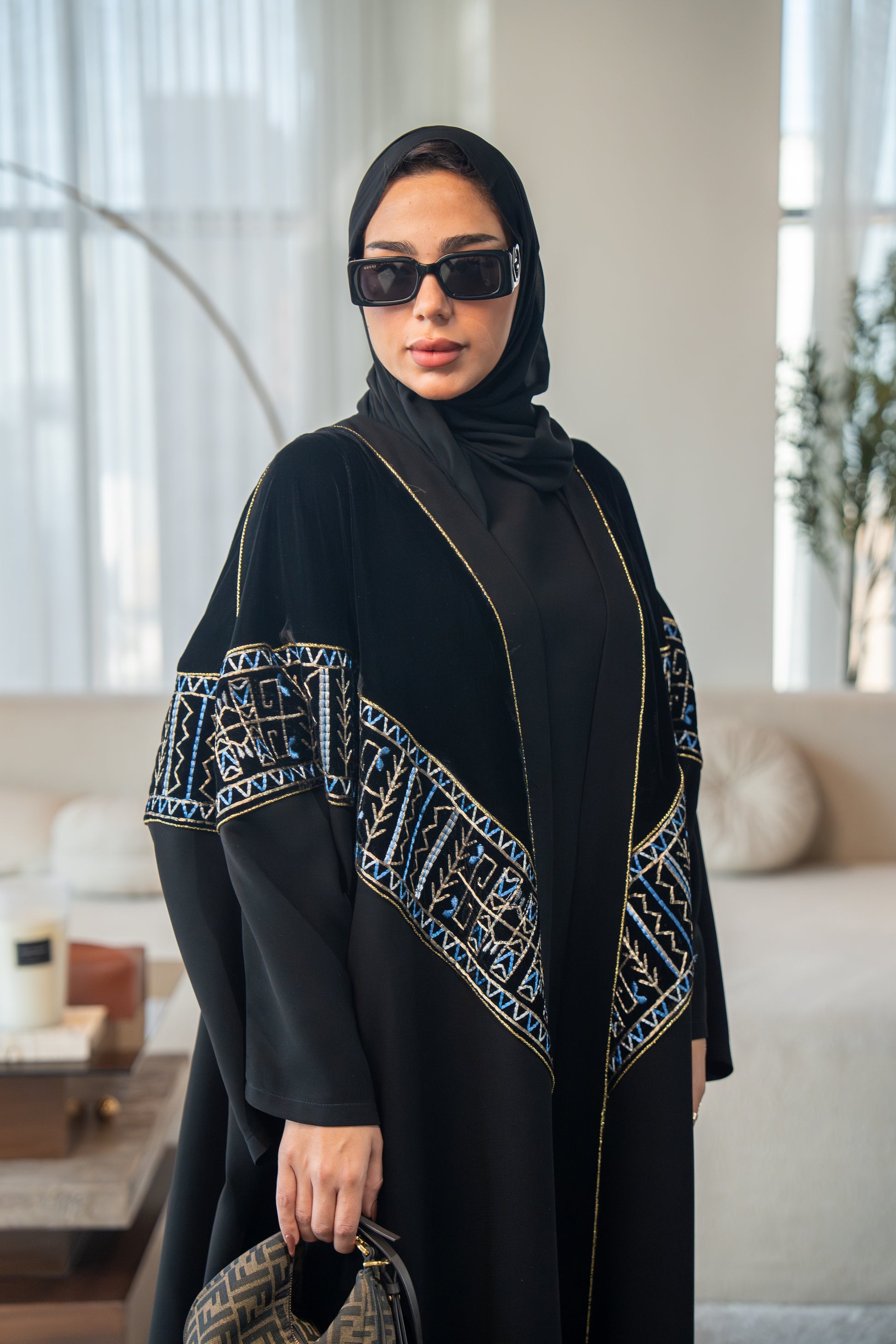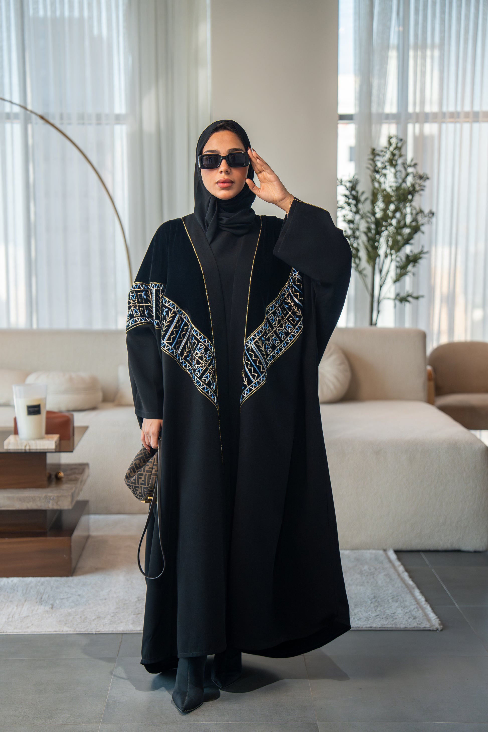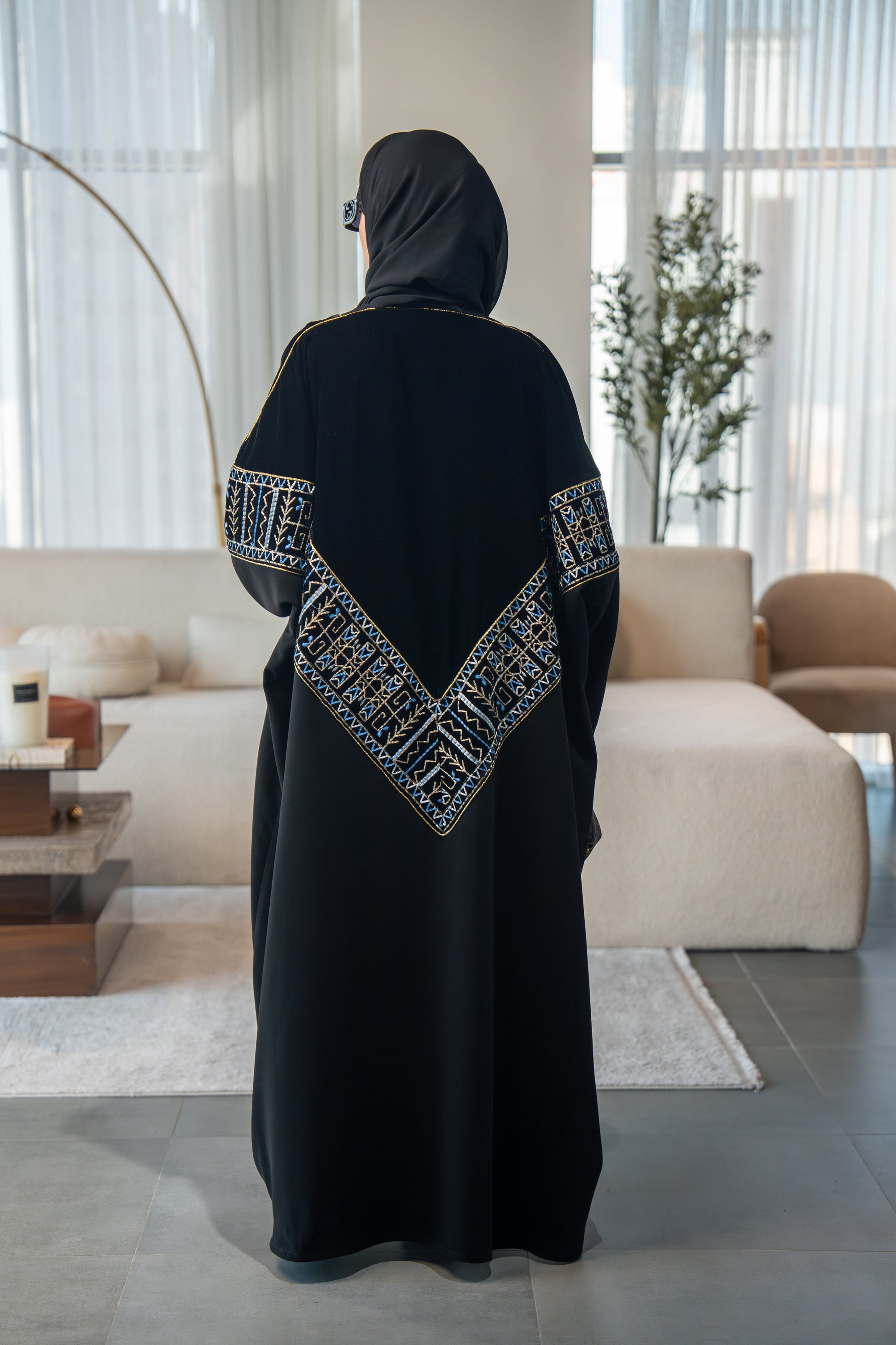 A black abaya designed with detailed geometric embroidery in rich gold and beige tones. Made from a soft, comfortable fabric with a structured, elegant look. Perfect for both everyday outings and special occasions.