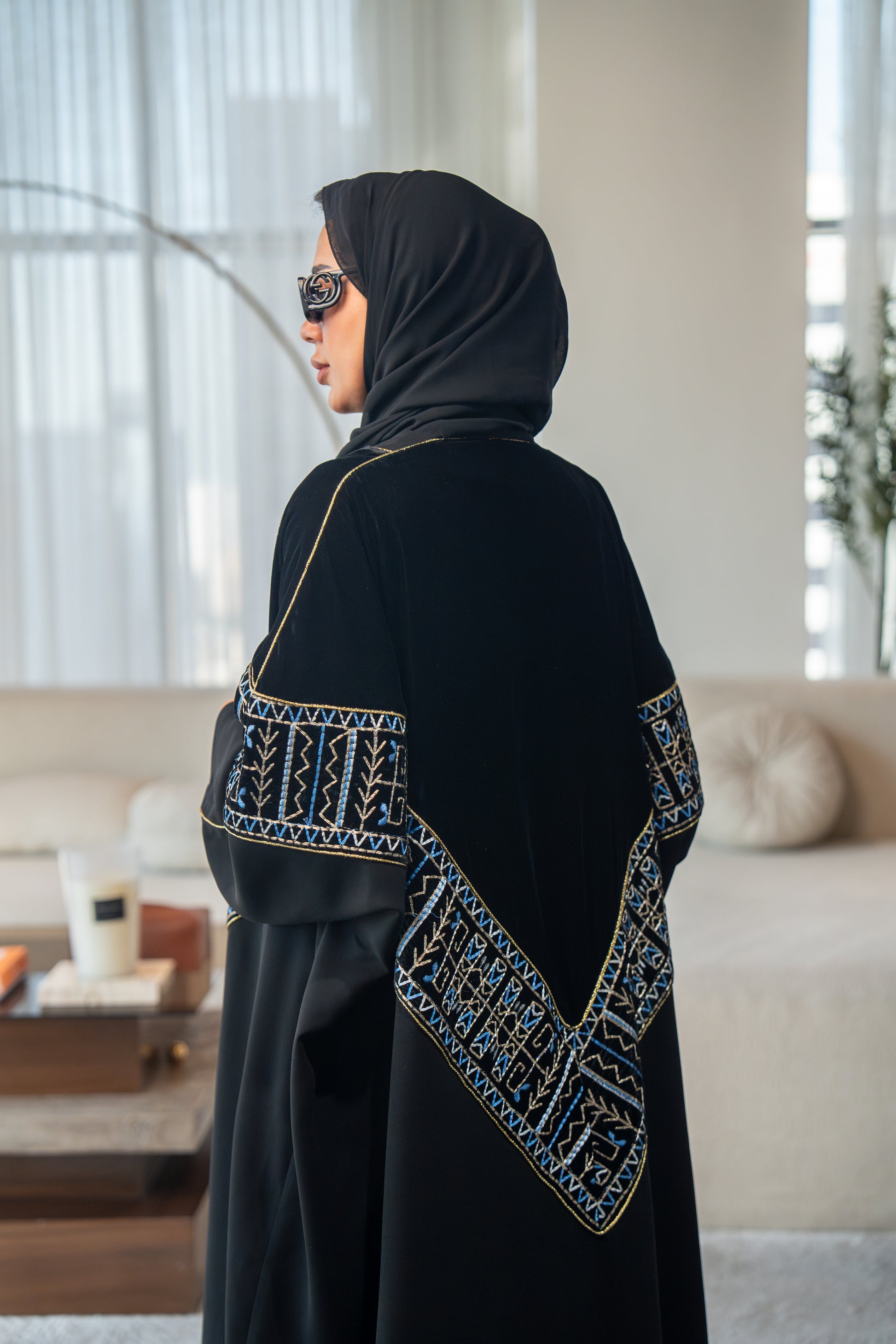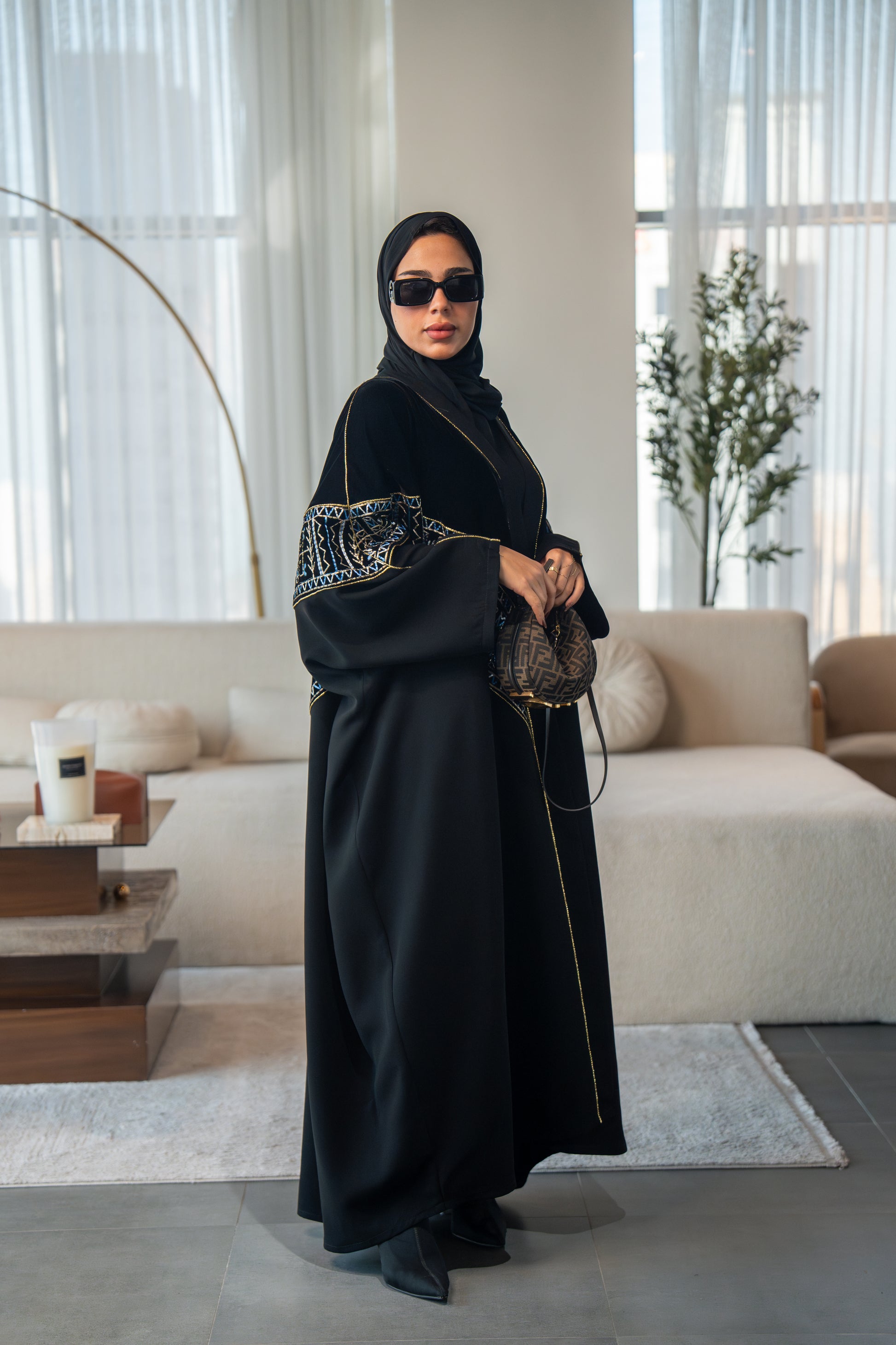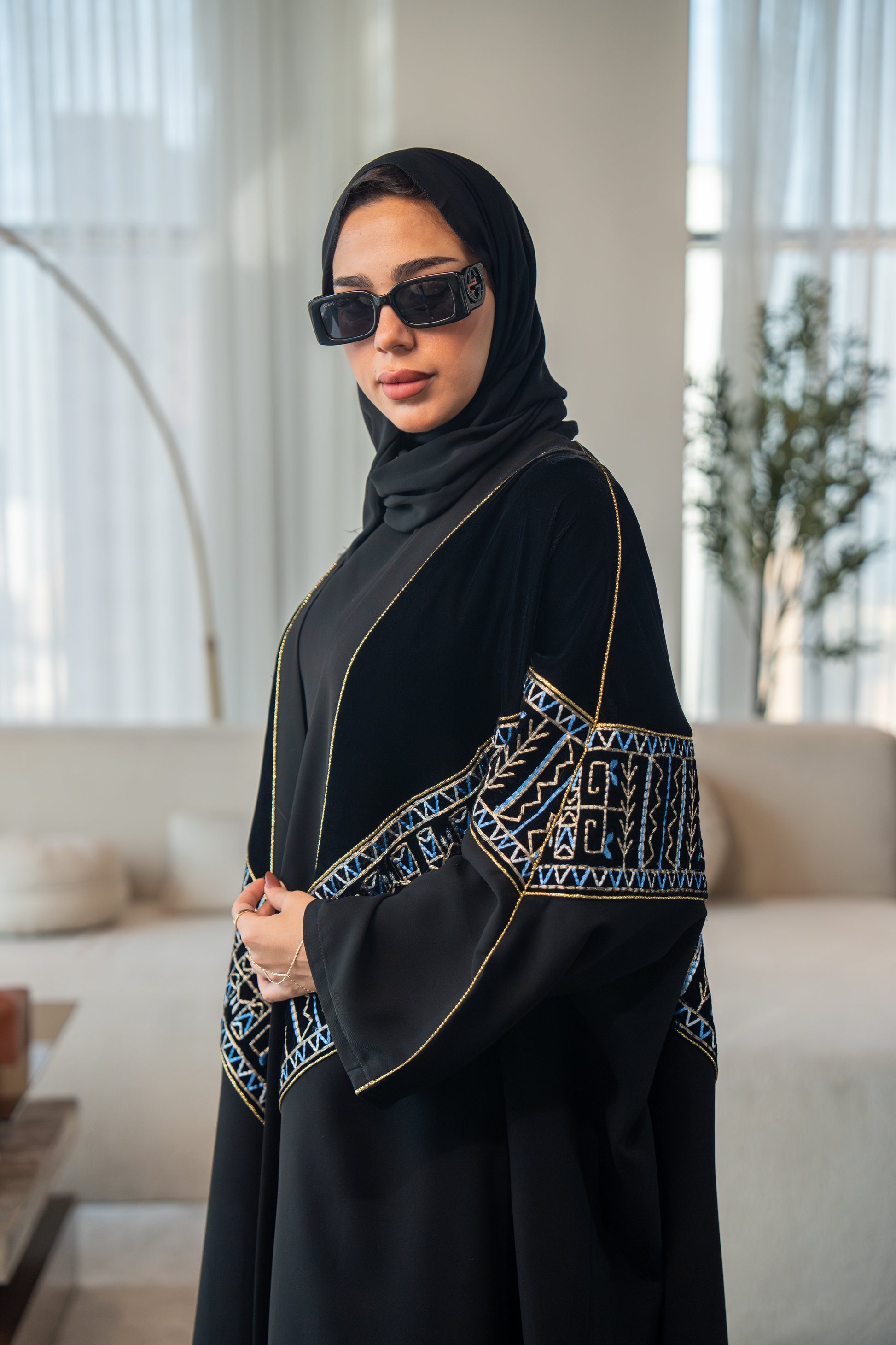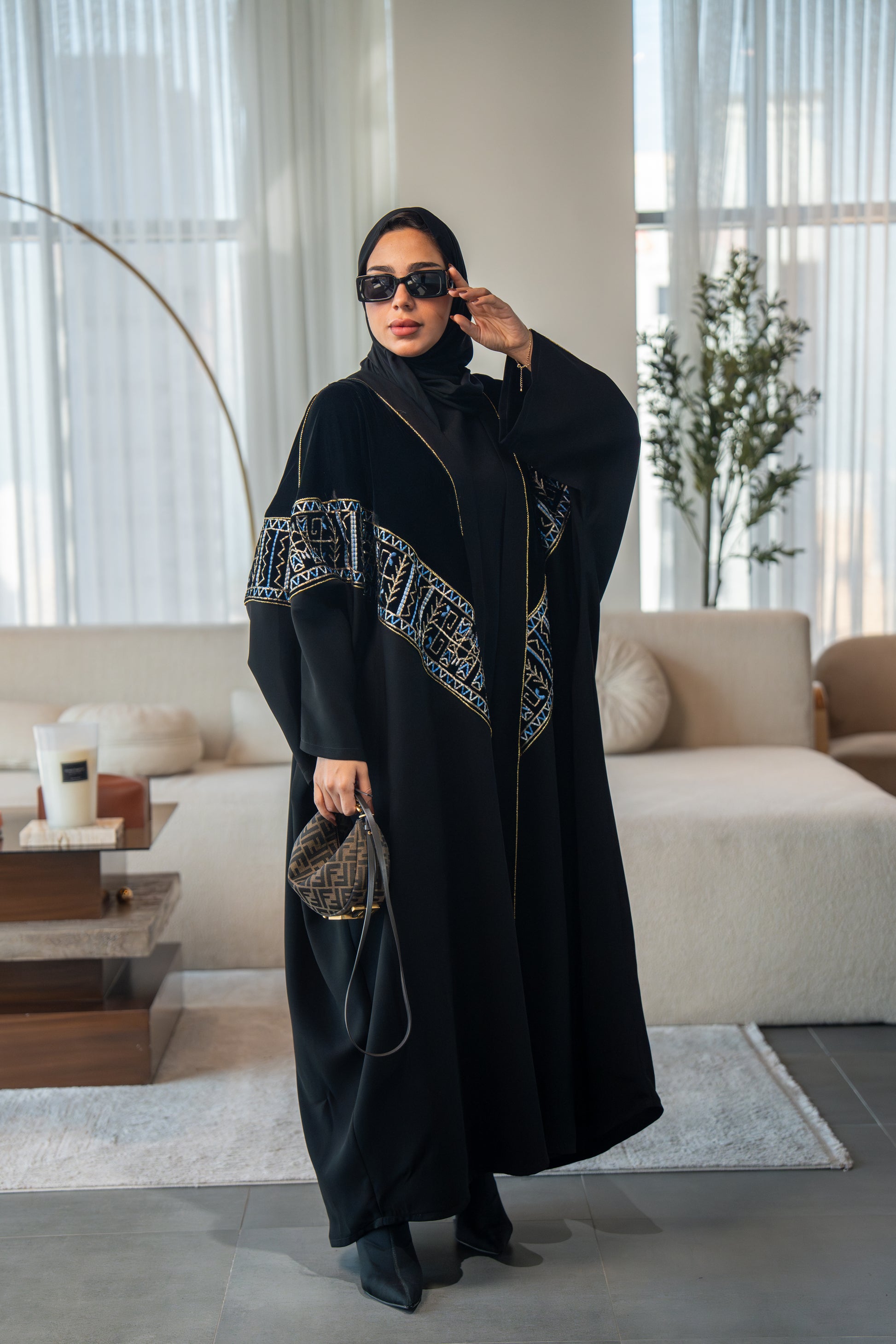 A black abaya designed with detailed geometric embroidery in rich gold and beige tones. Made from a soft, comfortable fabric with a structured, elegant look. Perfect for both everyday outings and special occasions.