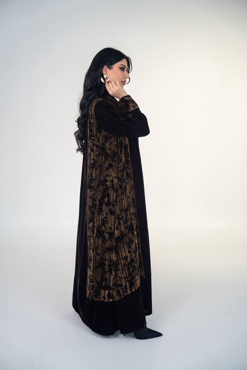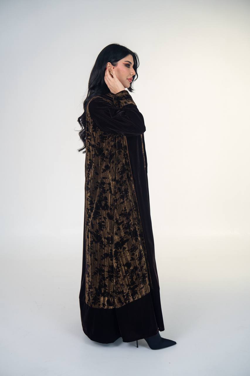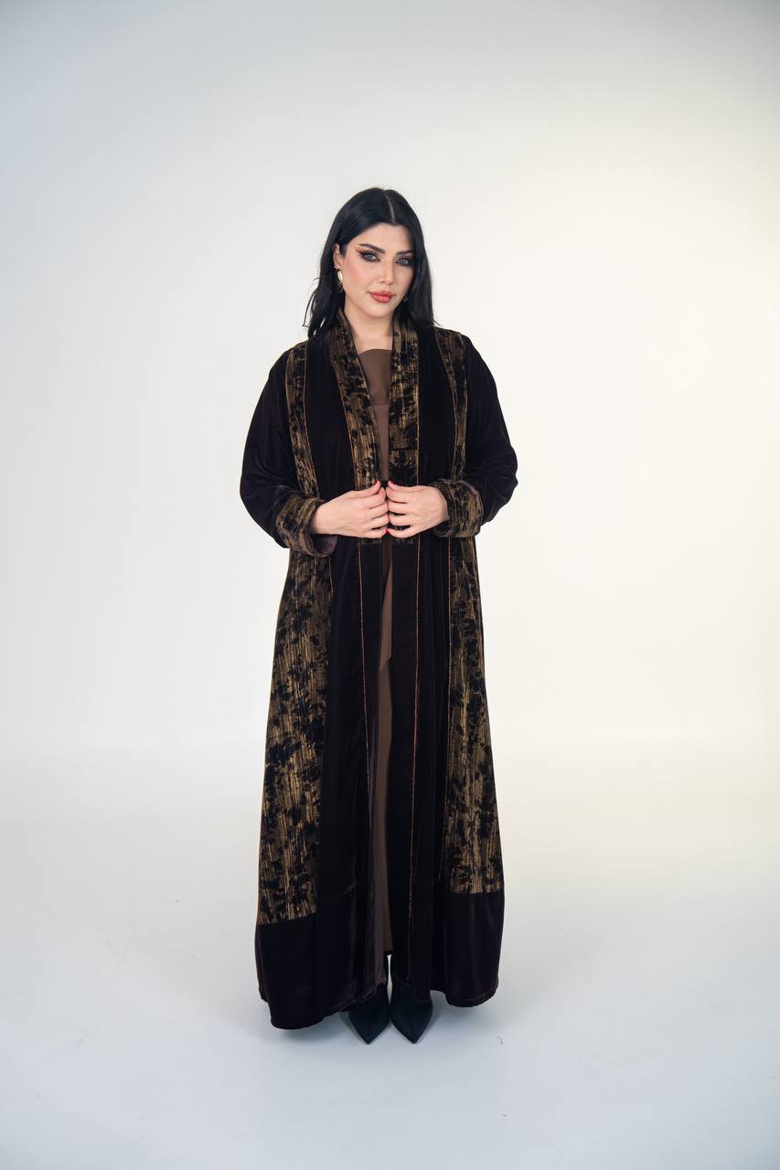عباية انيقة مصنوعة من اندماج خام المخمل السادة باللون الاسود مع المخمل المشجر ، تصميم عملي و راقي يناسب الدوام و الطلعات . متوفر بجميع المقاسات . ( السعر للعباية فقط و لا يشمل الطقم الداخلي )