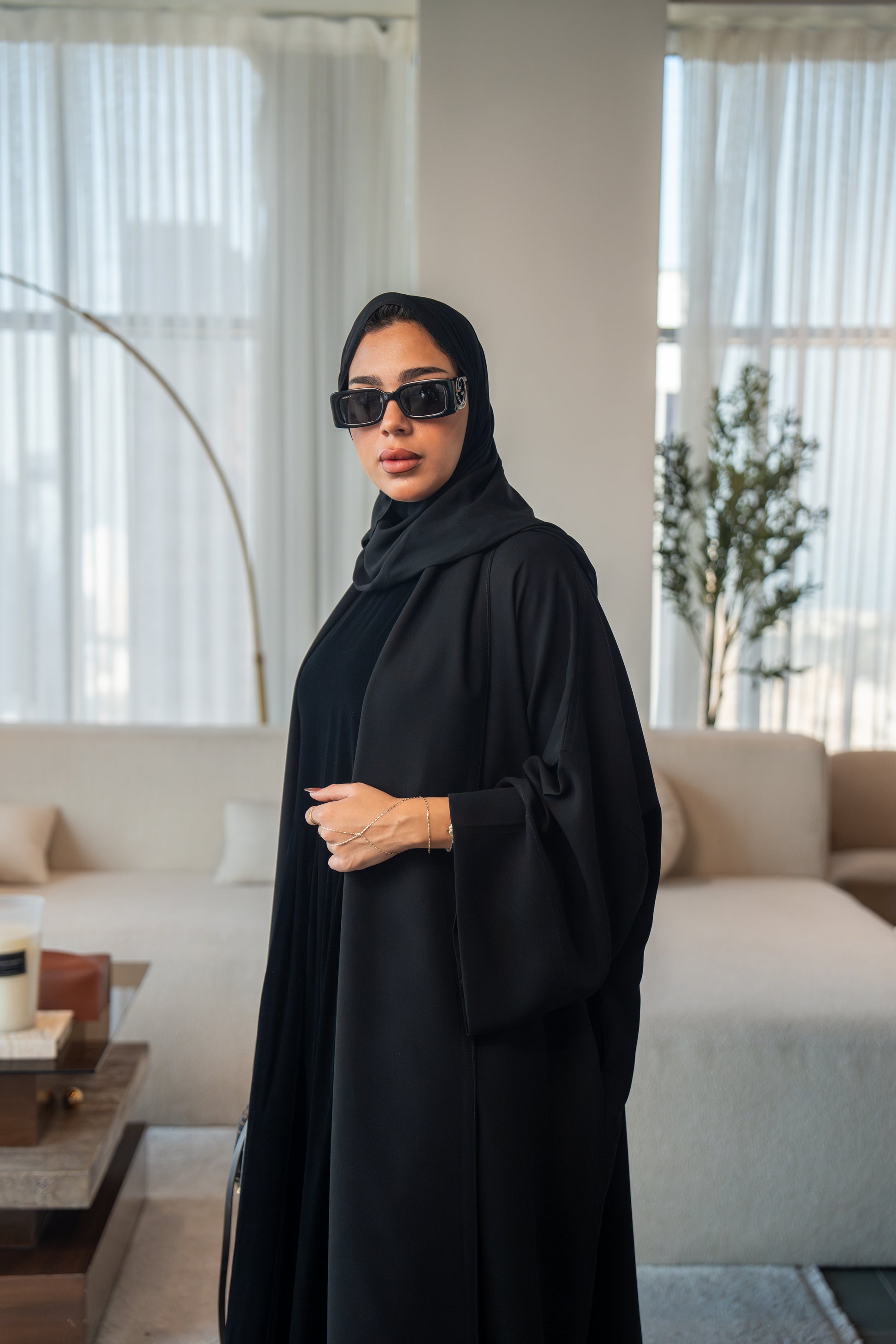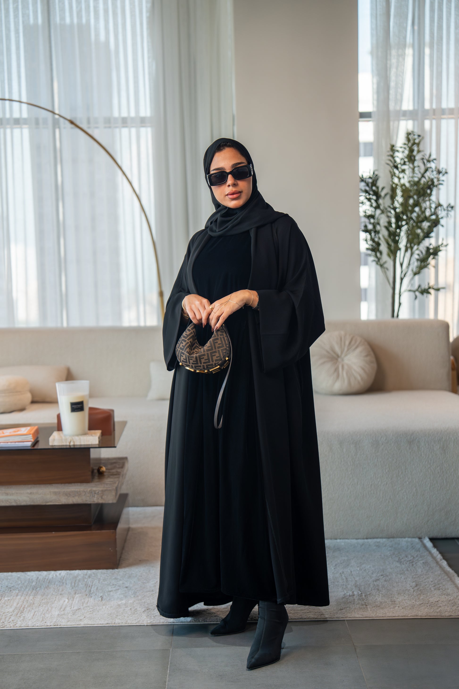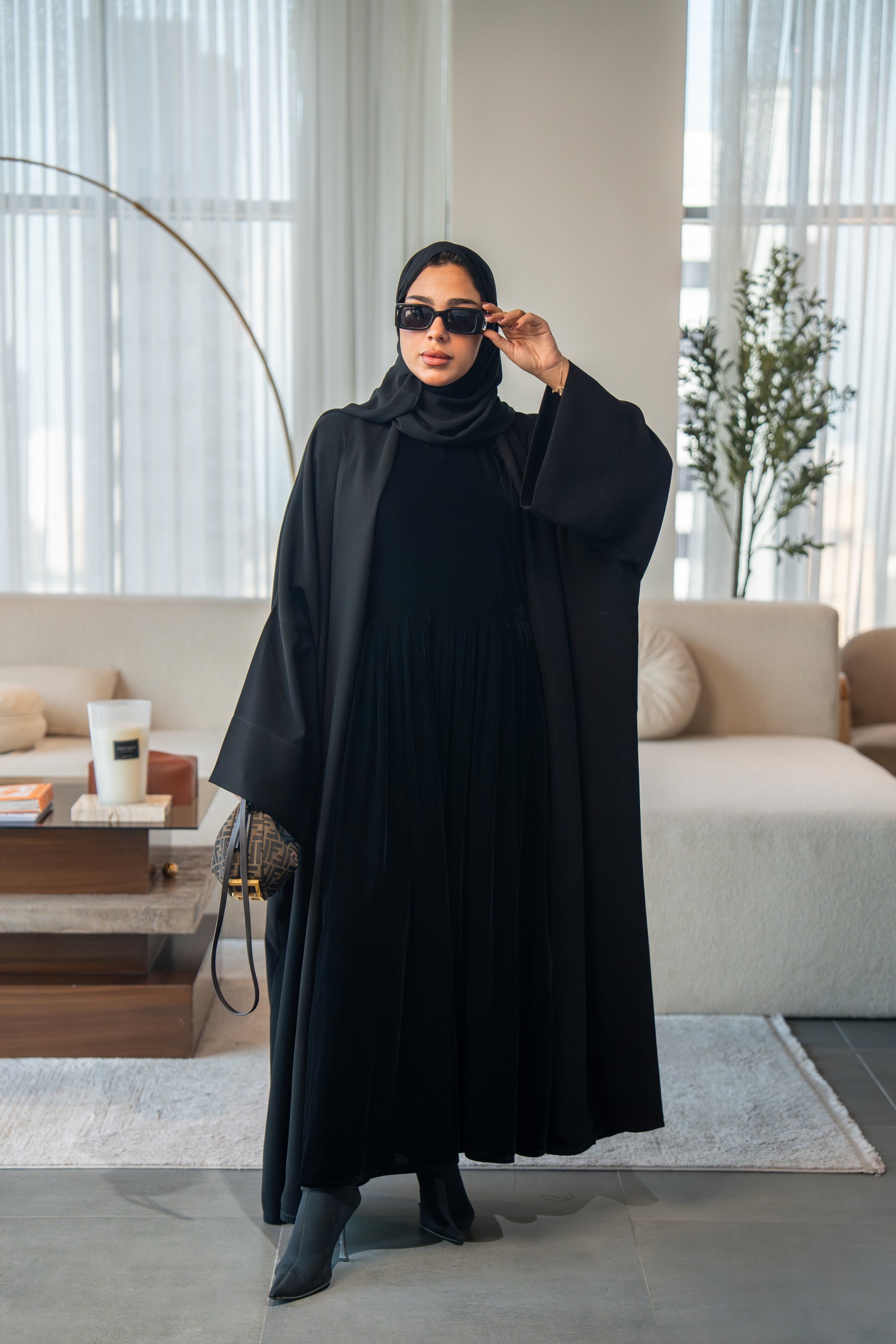 A classic all-black abaya crafted from soft velvet crepe fabric. Its smooth texture and graceful flow create a look that is effortlessly elegant. Perfect for any occasion, this abaya embodies simplicity, comfort, and timeless style.