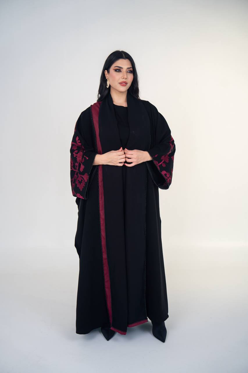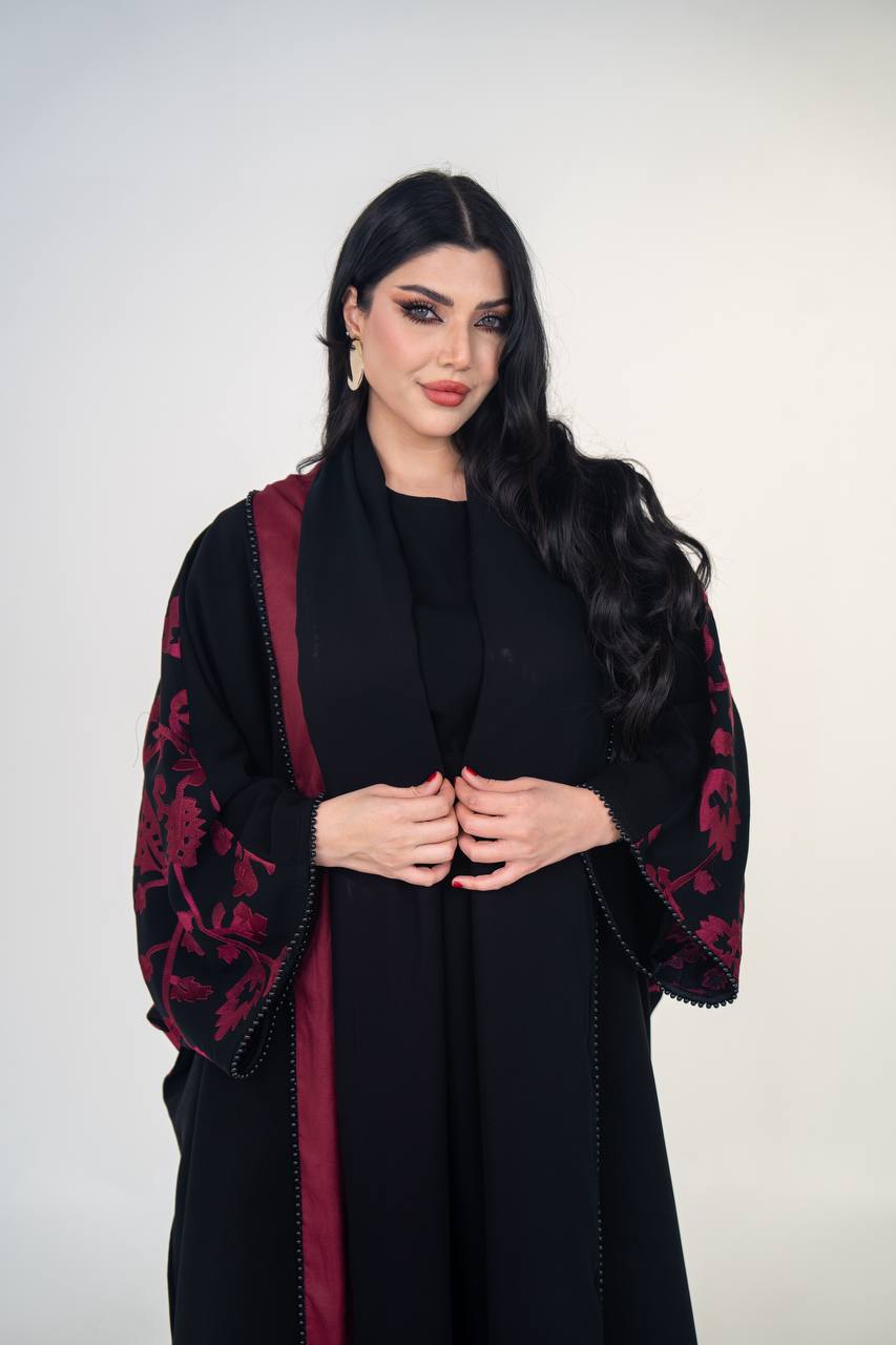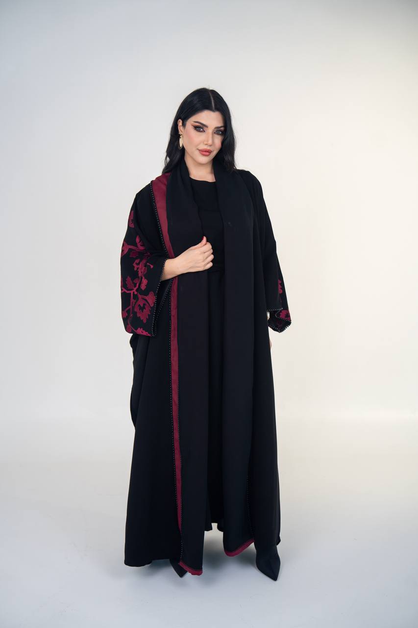 عباية بشت بخام المخمل الممتاز باللون الاسود مع لمسات من الكريب المطرز ، تصميم عملي و انيق يناسب الدوام و الطلعات . السعر للعباية فقط و لا يشمل الطقم الداخلي .