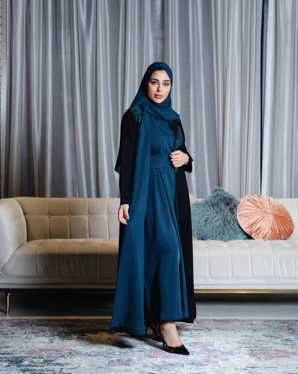 A black abaya made from luxurious crepe fabric with blue embroidery. Available in all sizes and lengths upon request. (Price is for the abaya only and does not include the undergarment.)