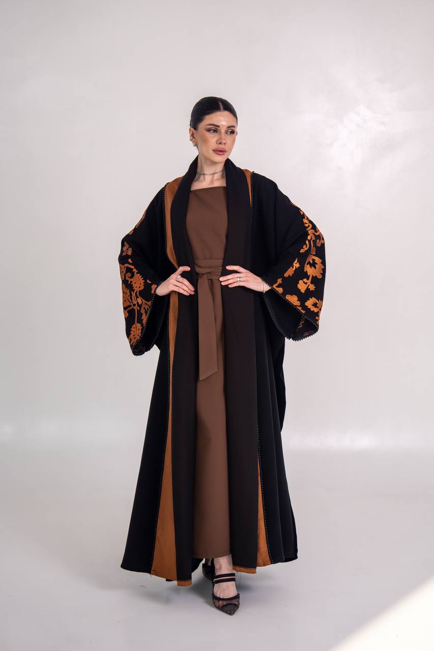 A black velvet abaya with embroidered crepe details, featuring a practical and elegant design suitable for work, outings, and university. (Price is for the abaya only and does not include the inner set.)